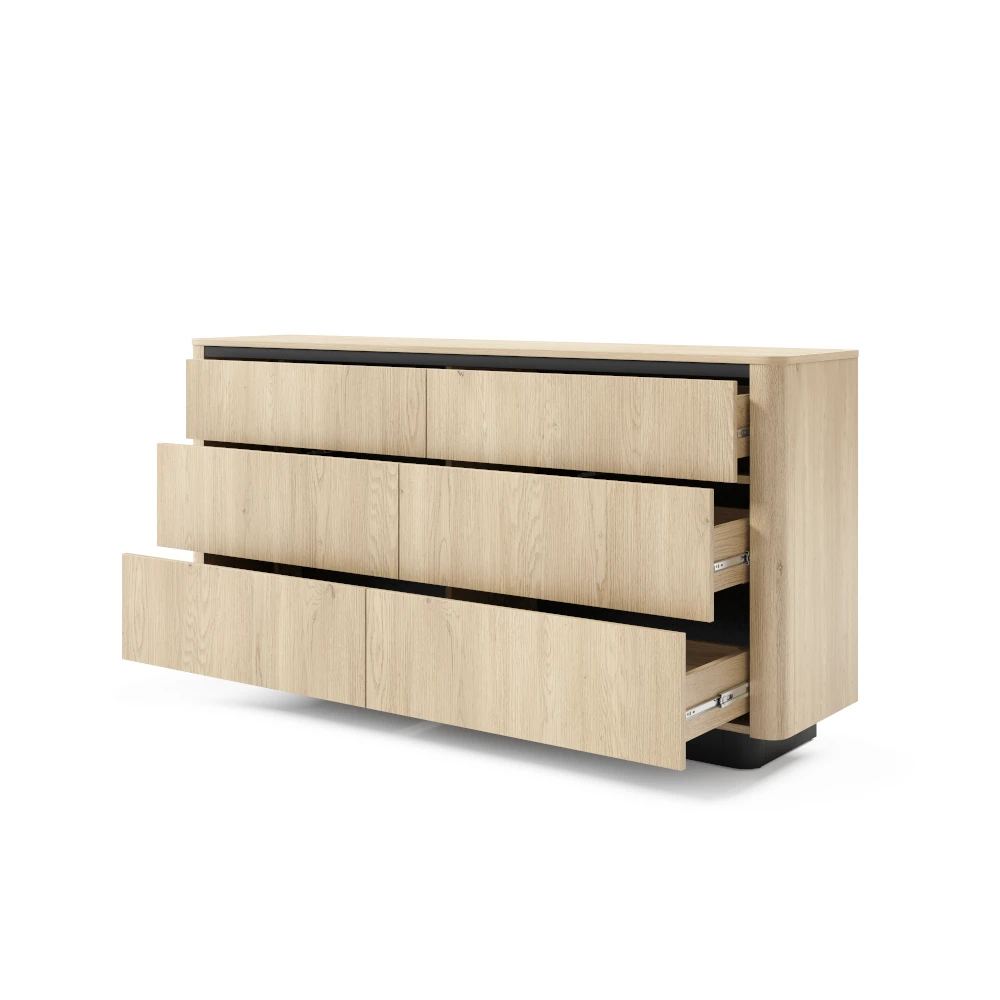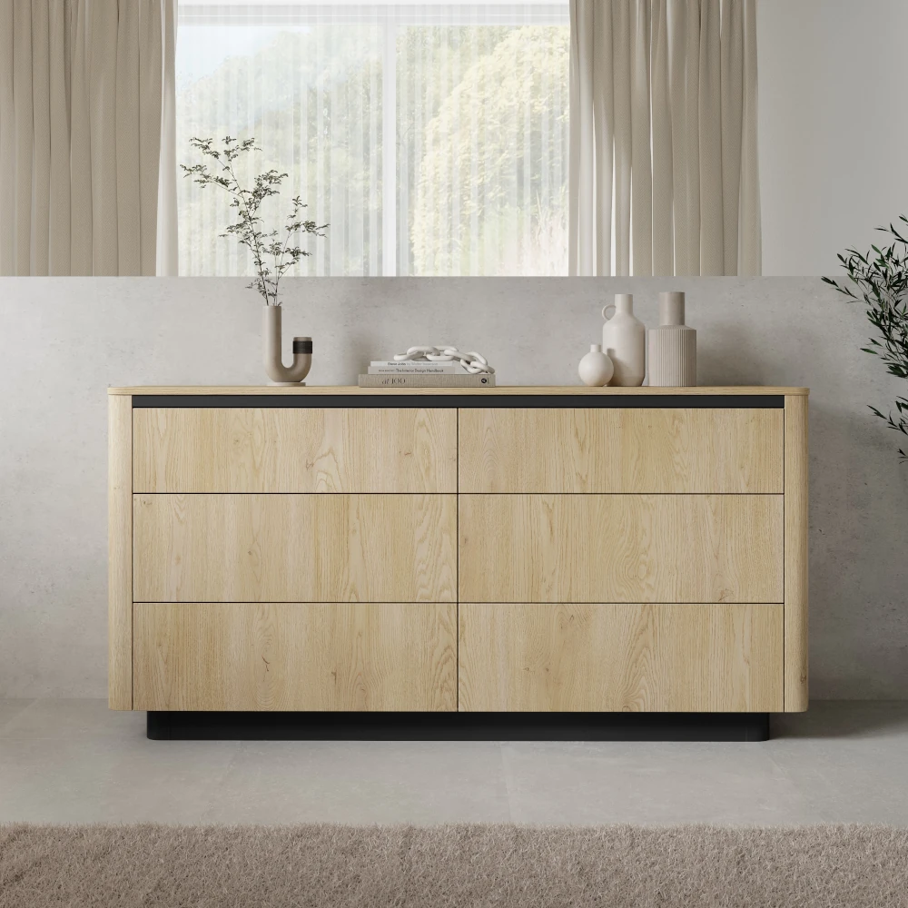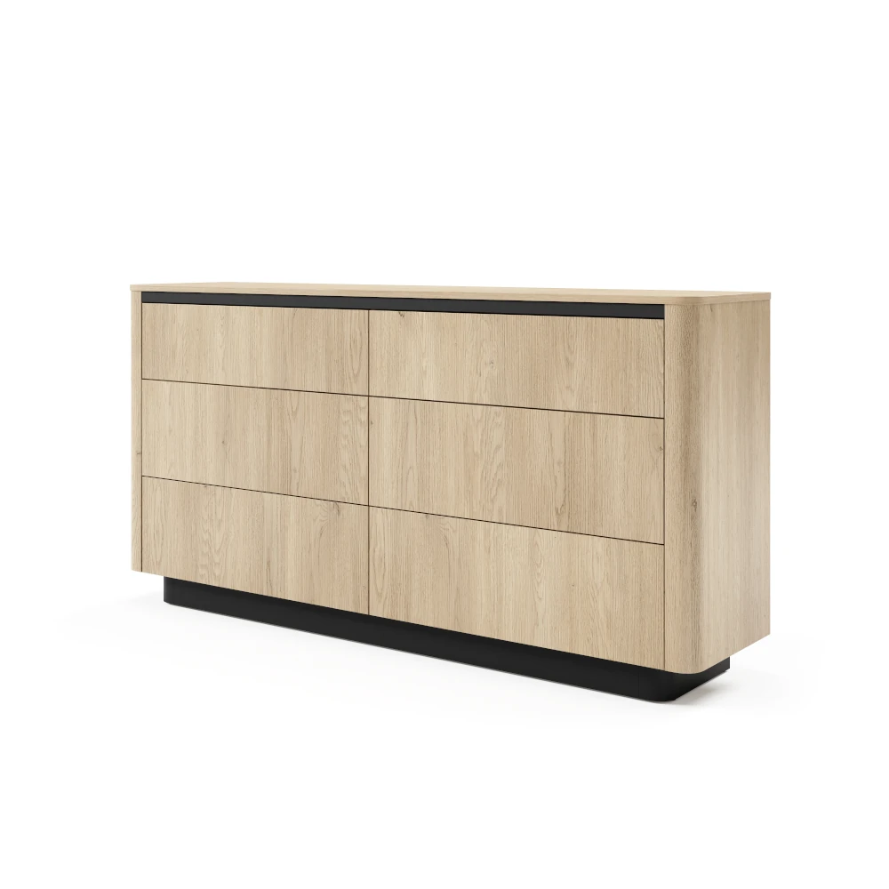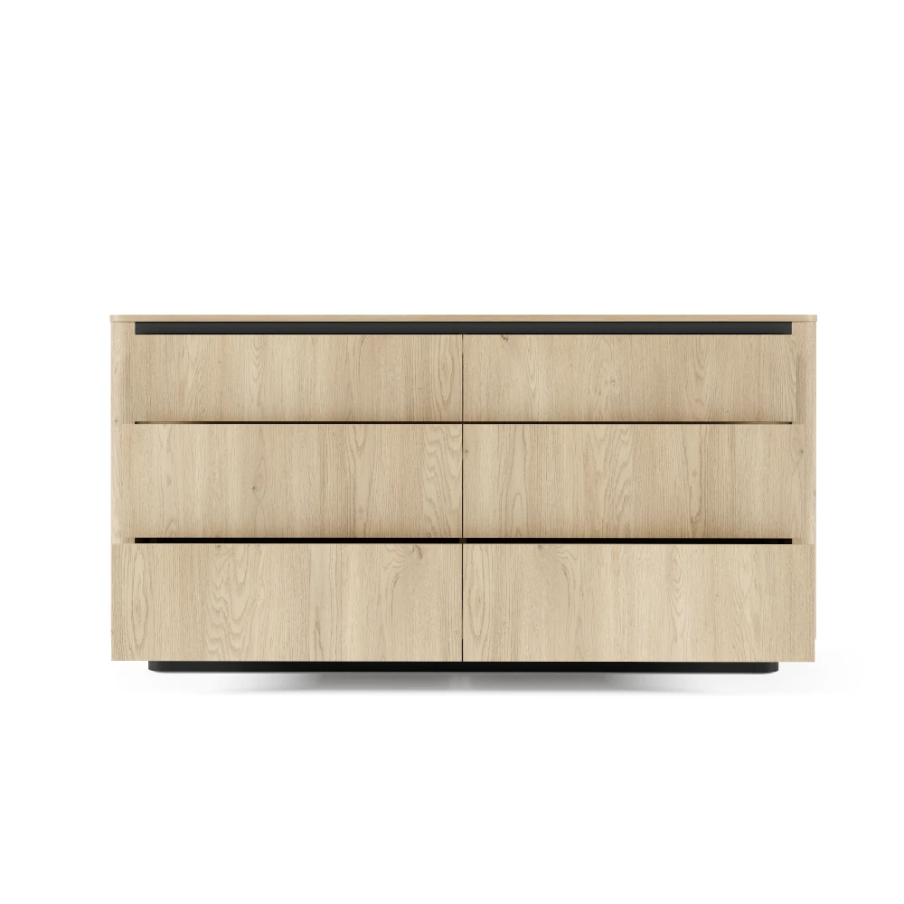 Pojemna komoda z szufladami Cala dąb Cremona łączy minimalistyczną formę z dużą ilością miejsca do przechowywania. Sześć szerokich szuflad ułatwia utrzymanie porządku w salonie, sypialni lub jadalni - zmieścisz w nich zarówno tekstylia, jak i dokumenty czy akcesoria codziennego użytku.