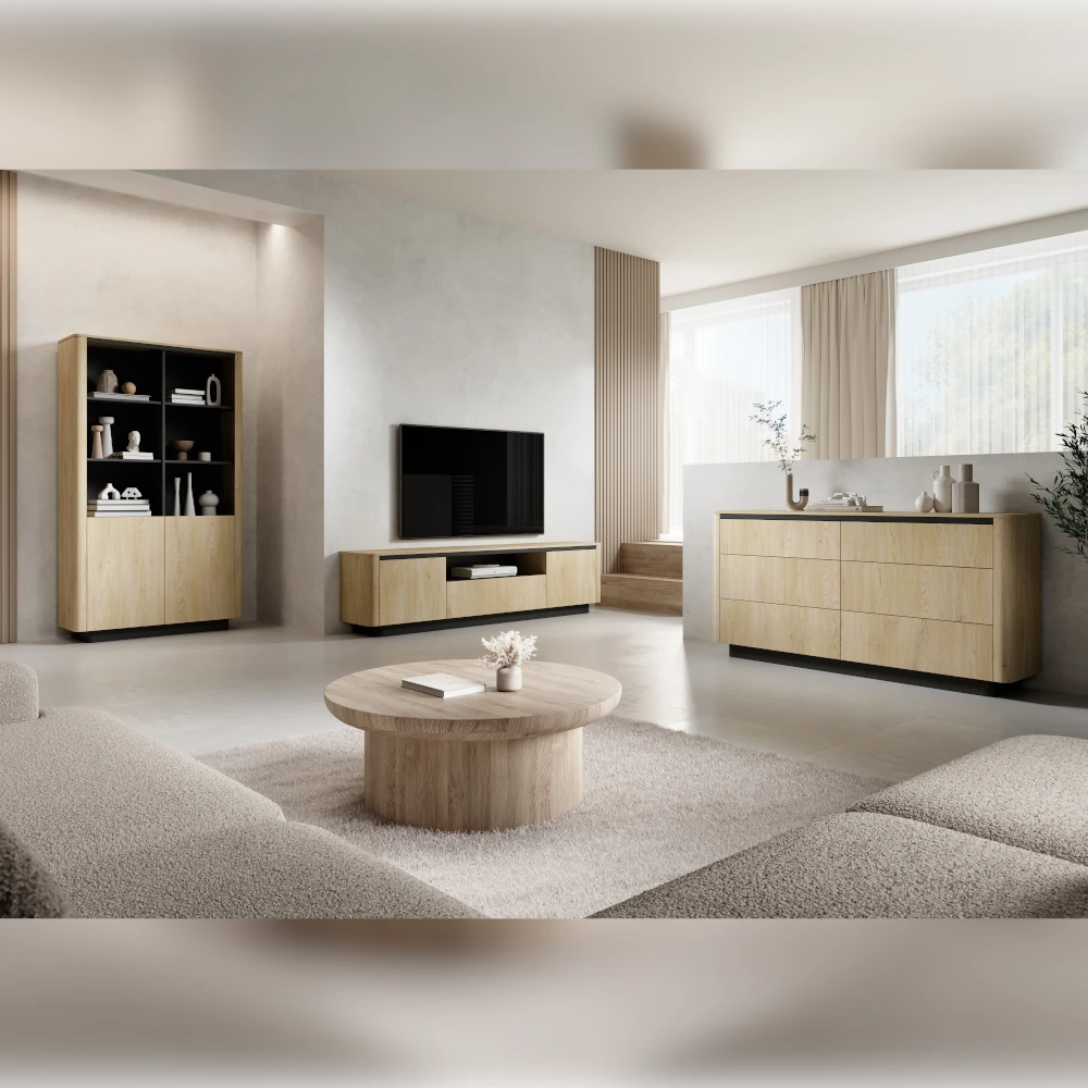 Korpus i fronty w dekorze dąb Cremona podkreślają ciepły, domowy charakter mebla, a ciemna podstawa dodaje całości lekkości i nowoczesnego wyrazu. Gładkie, bezuchwytowe fronty tworzą spójną, elegancką bryłę, która dobrze prezentuje się zarówno w aranżacjach skandynawskich, jak i bardziej nowoczesnych.