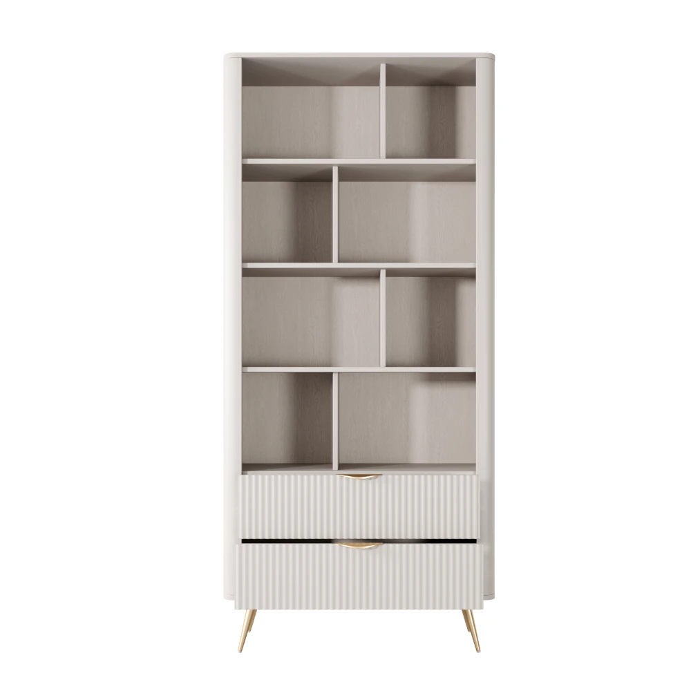 Regał Amelia z ryflowanymi szufladami to elegancki, nowoczesny mebel do salonu, sypialni lub domowego biura. Liczne otwarte półki i dwie pojemne szuflady z dekoracyjnym, ryflowanym frontem zapewniają wygodne miejsce na książki, dekoracje i akcesoria, jednocześnie dodając wnętrzu stylowego charakteru.