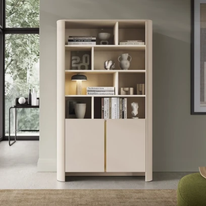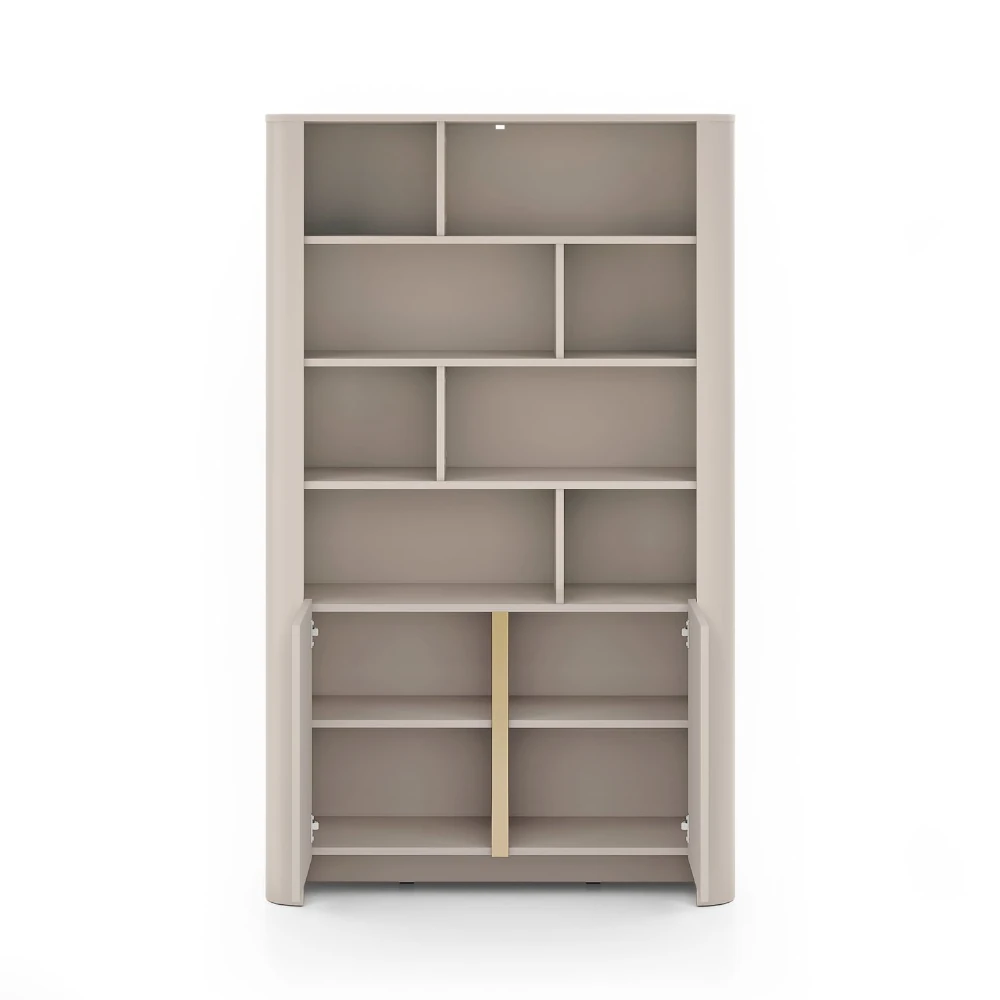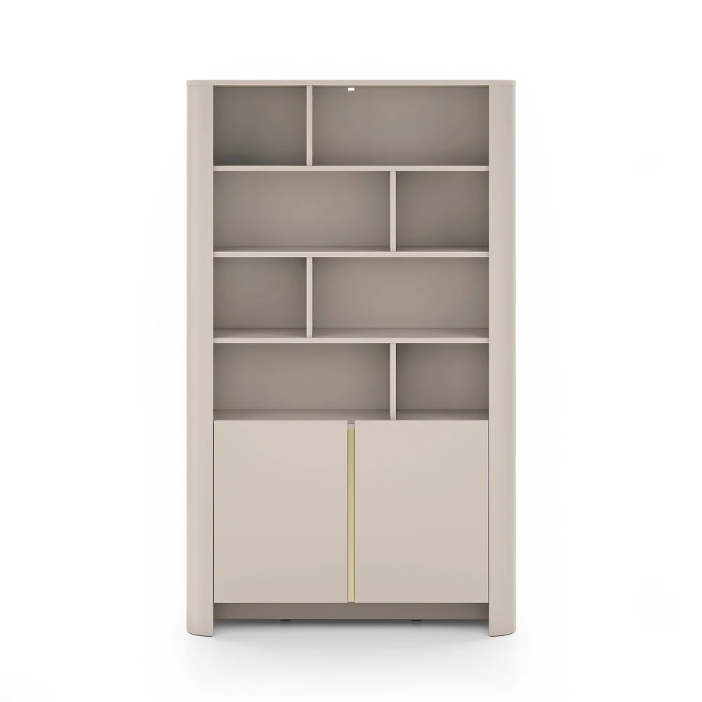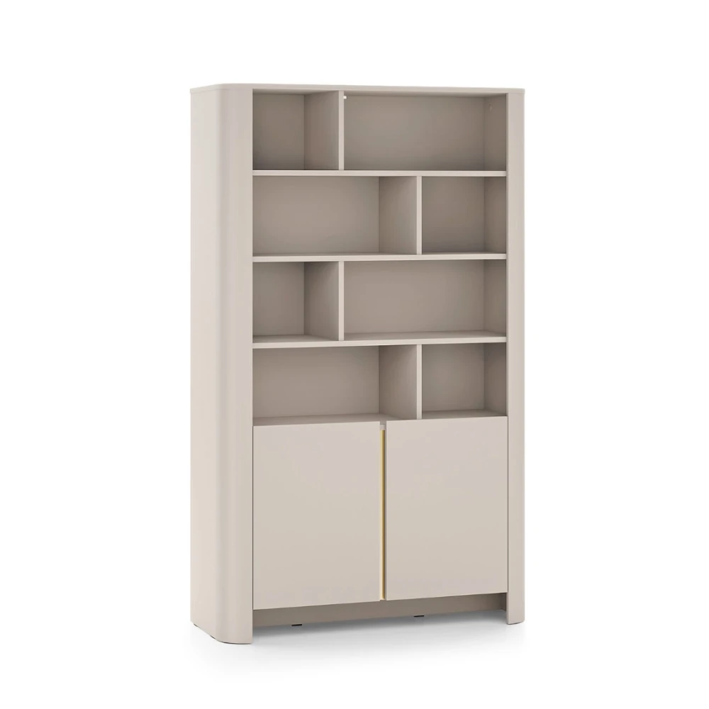 Regał Kairo z drzwiczkami w kolorze kaszmirowym to elegancki mebel do salonu lub domowego biura. Matowe fronty uzupełnione złotą listwą i zaokrąglone boki tworzą nowoczesną, przytulną formę, która pięknie eksponuje książki i dekoracje.