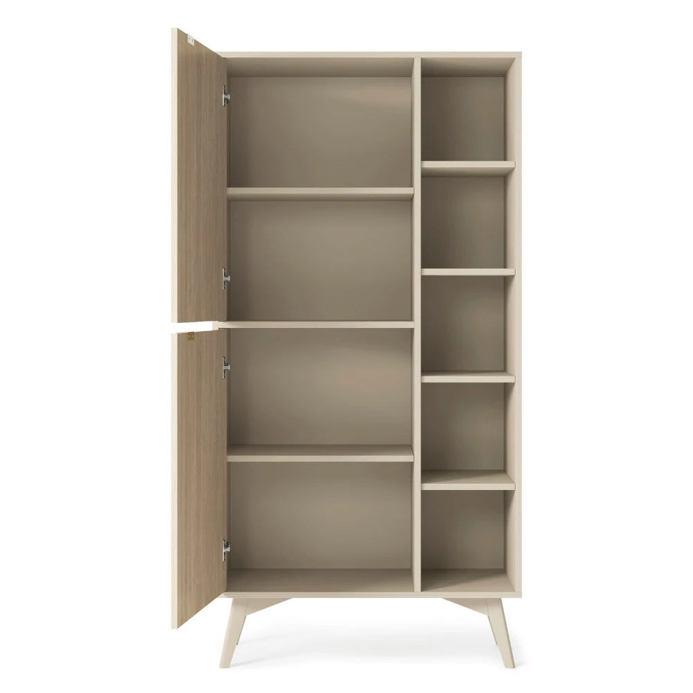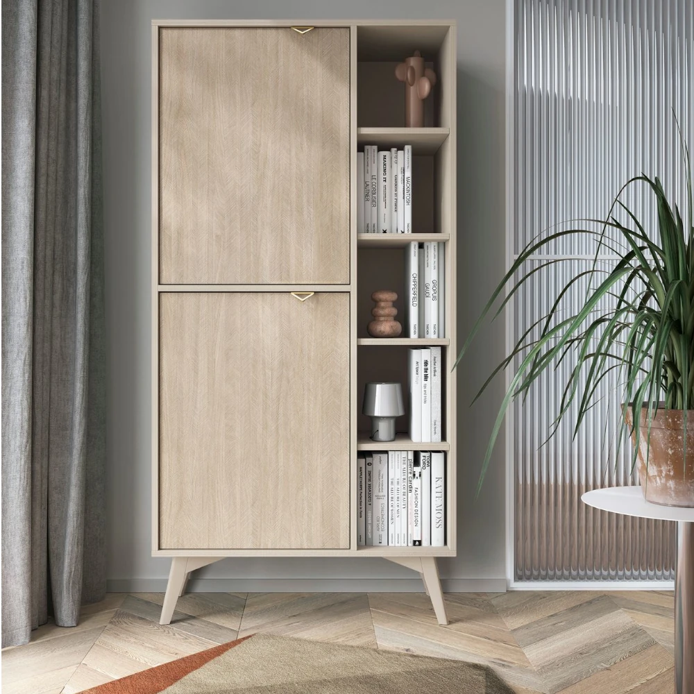 Regał Timber z drzwiczkami łączy funkcjonalność zamkniętej szafki z otwartymi półkami na książki i dekoracje. Fronty z delikatnym wzorem jodełki oraz złote uchwyty nadają mu elegancki charakter, a smukłe, skośne nogi dodają lekkości i podkreślają nowoczesny styl mebla.
