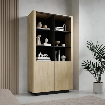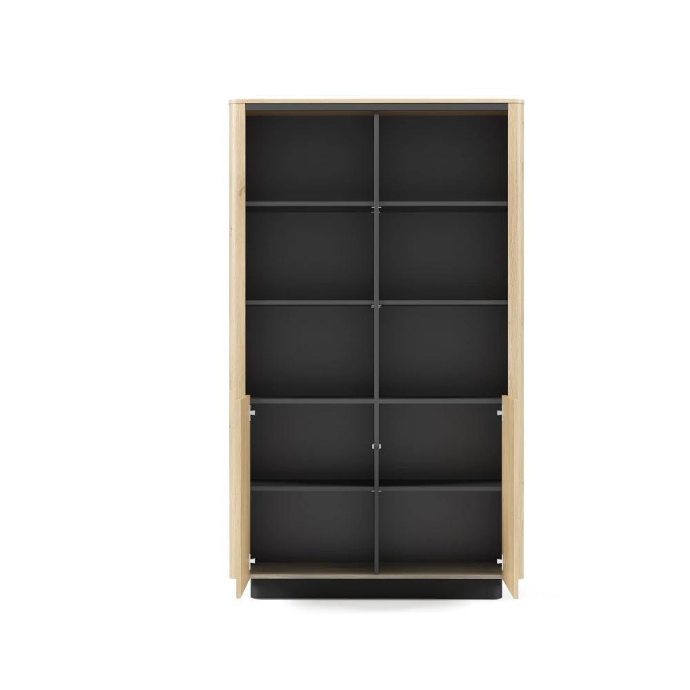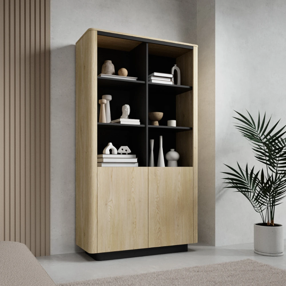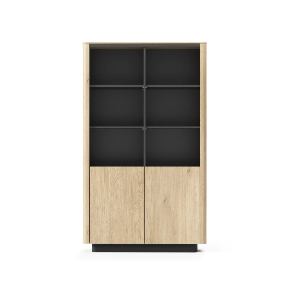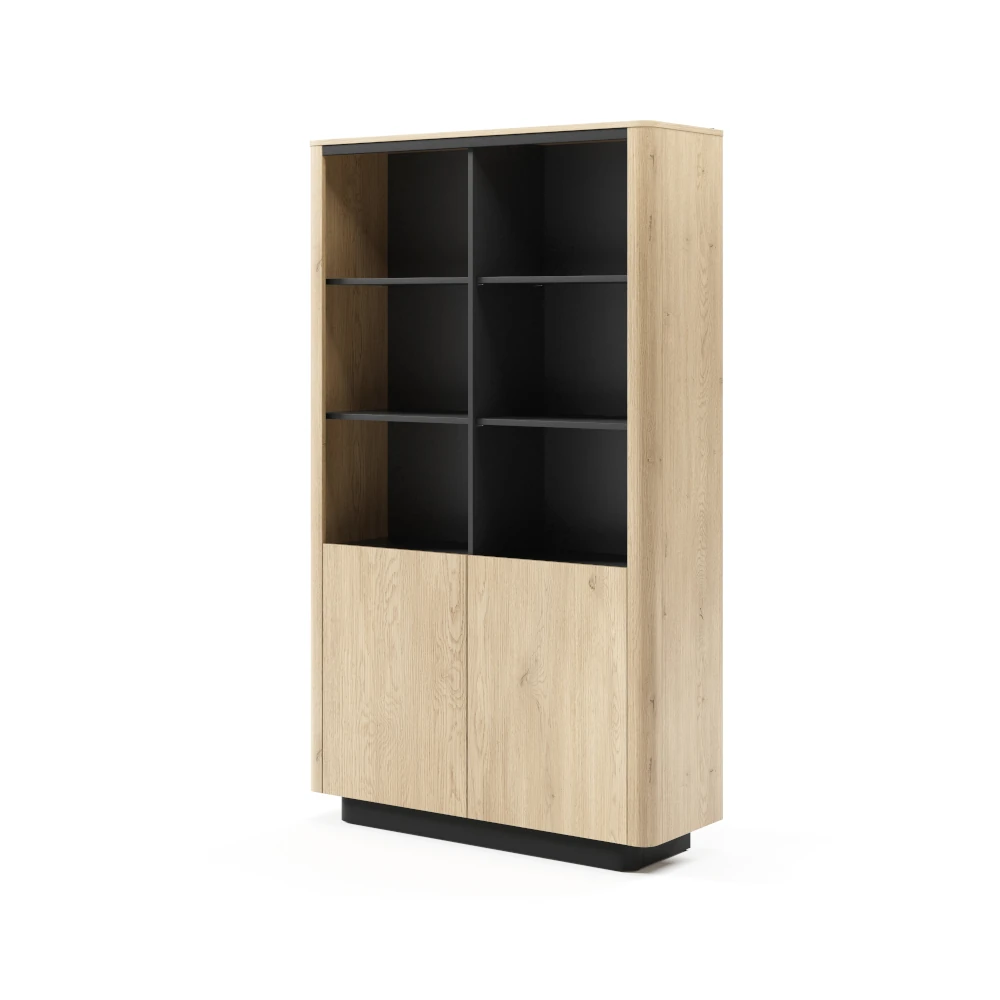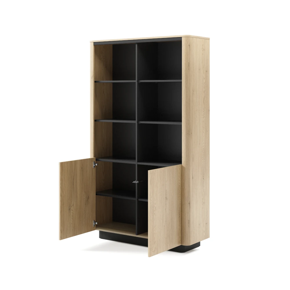 Regał z drzwiczkami Cala Dąb Cremona to wysoki, pojemny regał, który łączy ciepły dekor dębu z elegancką czernią wnętrza. Otwarte półki pięknie eksponują książki i dekoracje, a zamykana dolna część pozwala ukryć mniej reprezentacyjne przedmioty. Nowoczesna forma na solidnej podstawie sprawia, że regał idealnie uzupełnia salon, jadalnię lub domowe biuro.