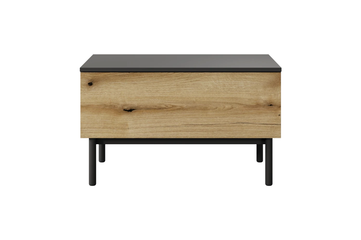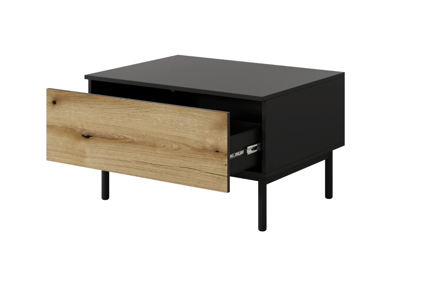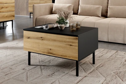 Stolik kawowy Largo z szufladą czarny, dąb Evoke to praktyczny i designerski mebel do salonu, który łączy industrialny charakter czarnego korpusu z ciepłem dekoru dąb Evoke oraz oferuje pojemną szufladę na podręczne drobiazgi.