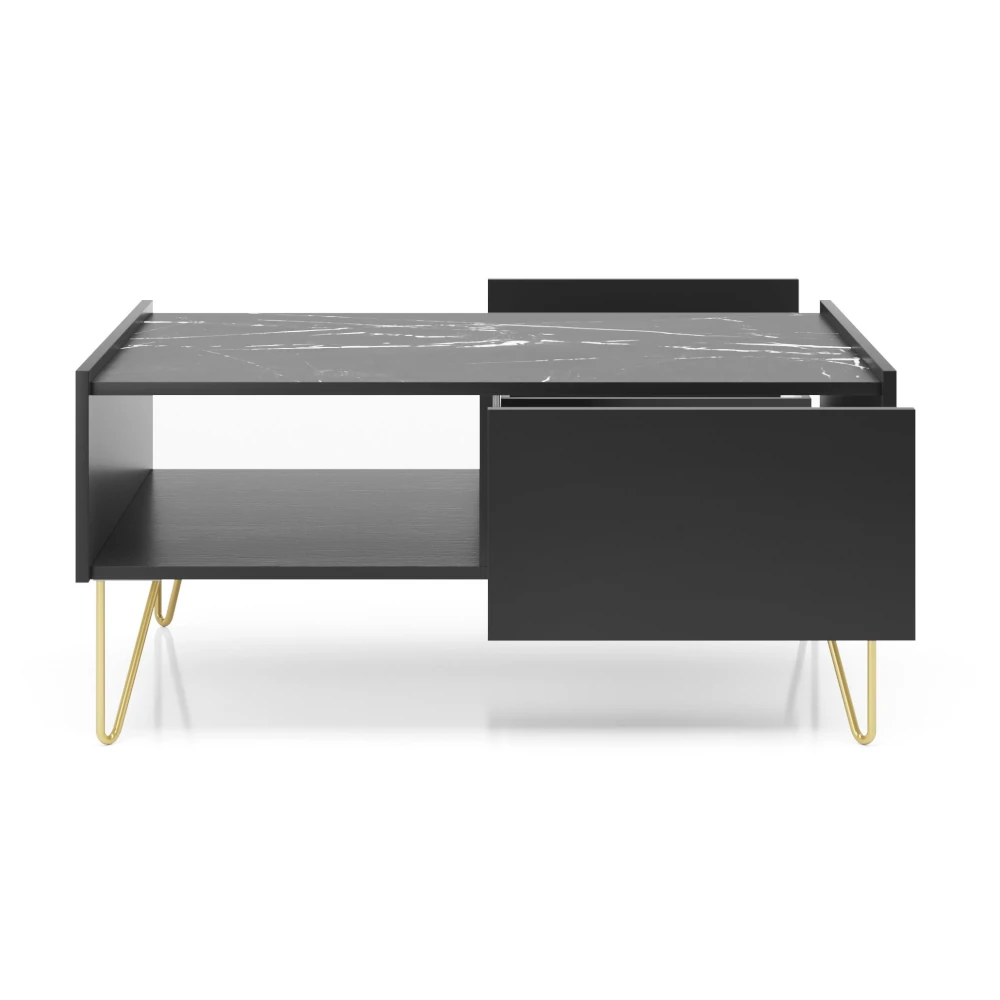 Stolik kawowy Loft Gold z szufladami to elegancki stolik do salonu, który łączy minimalistyczną bryłę z efektownymi detalami. Blat w dekorze kamienia, praktyczna otwarta półka oraz pojemna szuflada tworzą wygodne miejsce na piloty, czasopisma i drobiazgi, a smukłe złote nogi nadają całości luksusowego charakteru.
