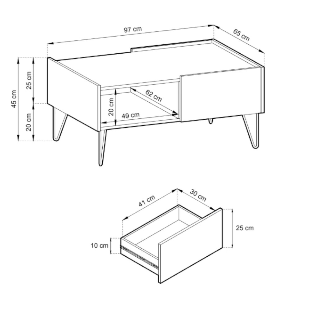 Pod blatem znajduje się praktyczna otwarta półka, na której wygodnie odłożysz książki, magazyny lub piloty. Z jednej strony umieszczono pojemne szuflady na prowadnicach, doskonałe do przechowywania mniejszych akcesoriów, ładowarek czy notesów - dzięki temu wszystko, czego potrzebujesz podczas relaksu w salonie, zawsze jest pod ręką, ale dyskretnie ukryte.