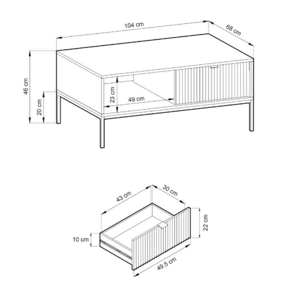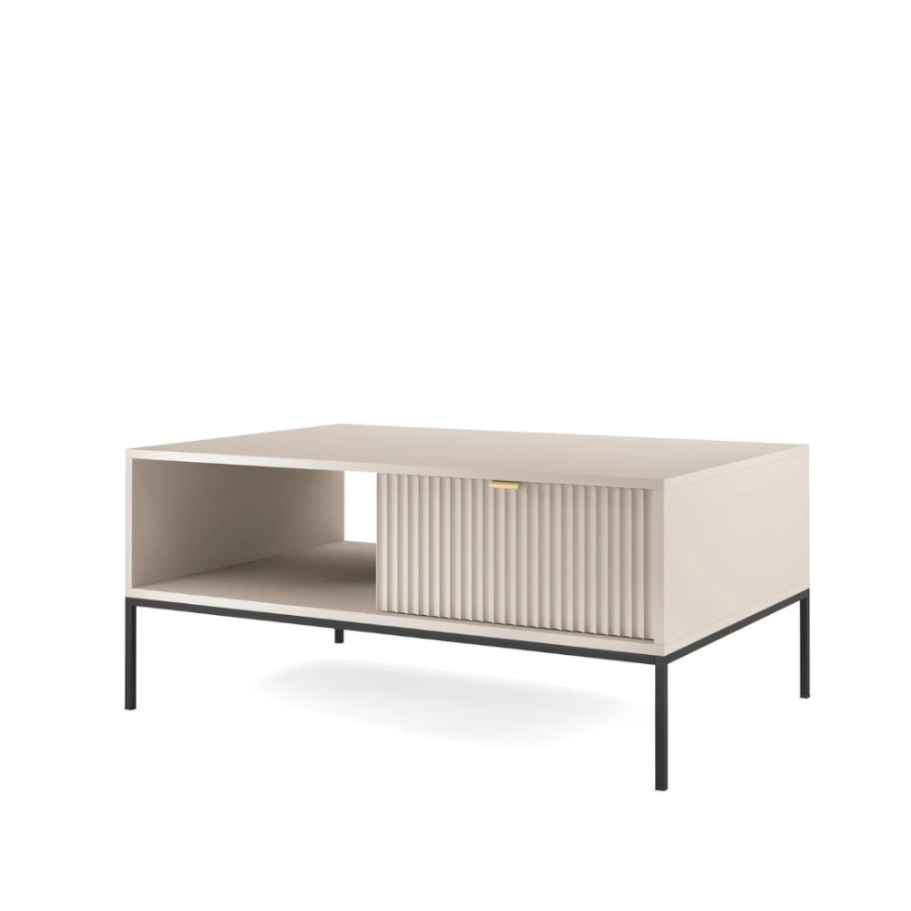 Stolik kawowy Nuo to idealne połączenie estetyki i funkcjonalności. Prosta bryła w nowoczesnej formie została uzupełniona o charakterystyczne ryflowane fronty dwóch szuflad, które nadają meblowi dekoracyjnego, eleganckiego wyrazu. Delikatna forma stolika wsparta jest na smukłych metalowych nogach, co podkreśla jego lekkość i współczesny styl.