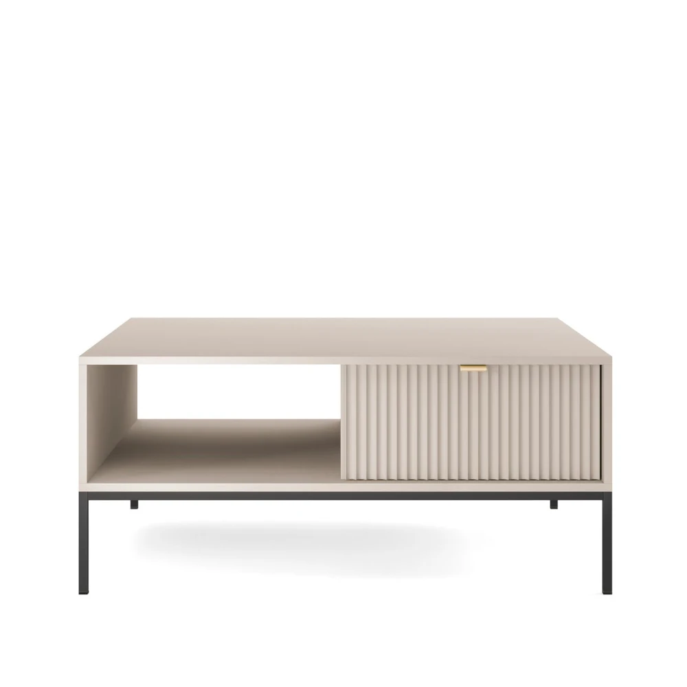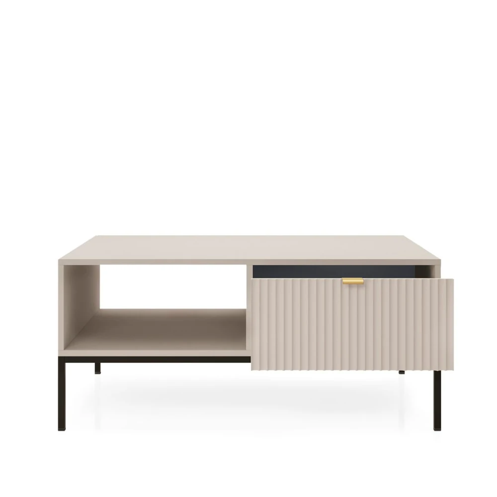 Stolik kawowy Nuo wyróżnia się minimalistyczną formą i dekoracyjnymi, ryflowanymi frontami podwójnych szuflad. Otwarta półka i praktyczne schowki zapewniają wygodną organizację w salonie, a lekka konstrukcja dodaje wnętrzu nowoczesnego charakteru.