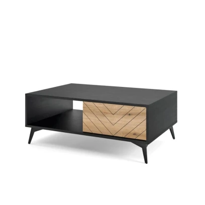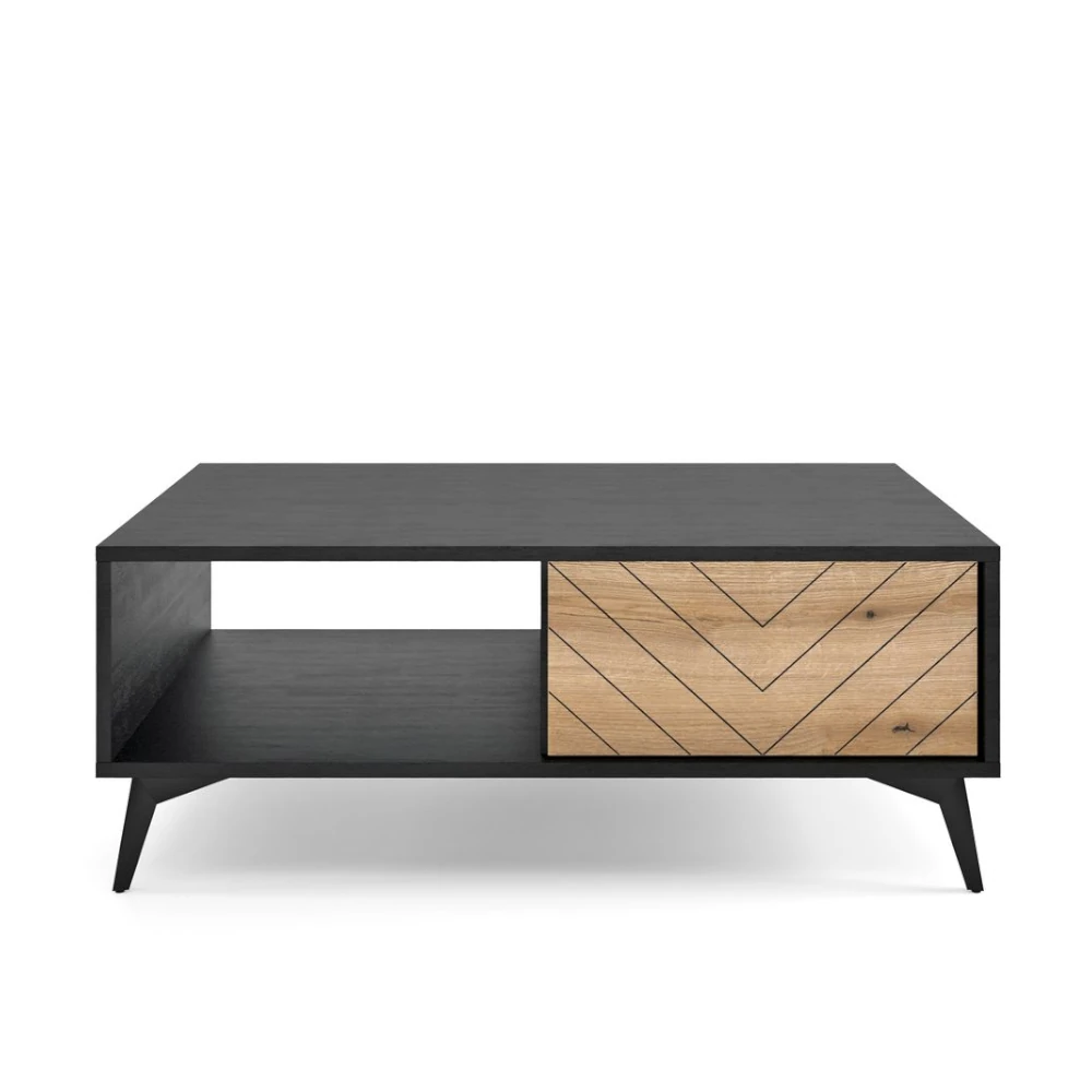 Stolik kawowy Valmo z szufladami to loftowy stolik do salonu, który łączy czarny korpus z frontem w dekorze dębu z frezowanym wzorem jodełki. Pojemne szuflady i otwarta półka ułatwiają przechowywanie pilotów, gazet i akcesoriów, a solidny blat zapewnia wygodne miejsce na kawę i dekoracje.