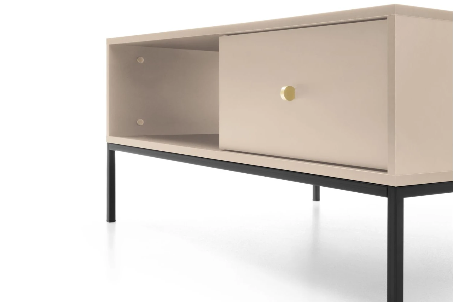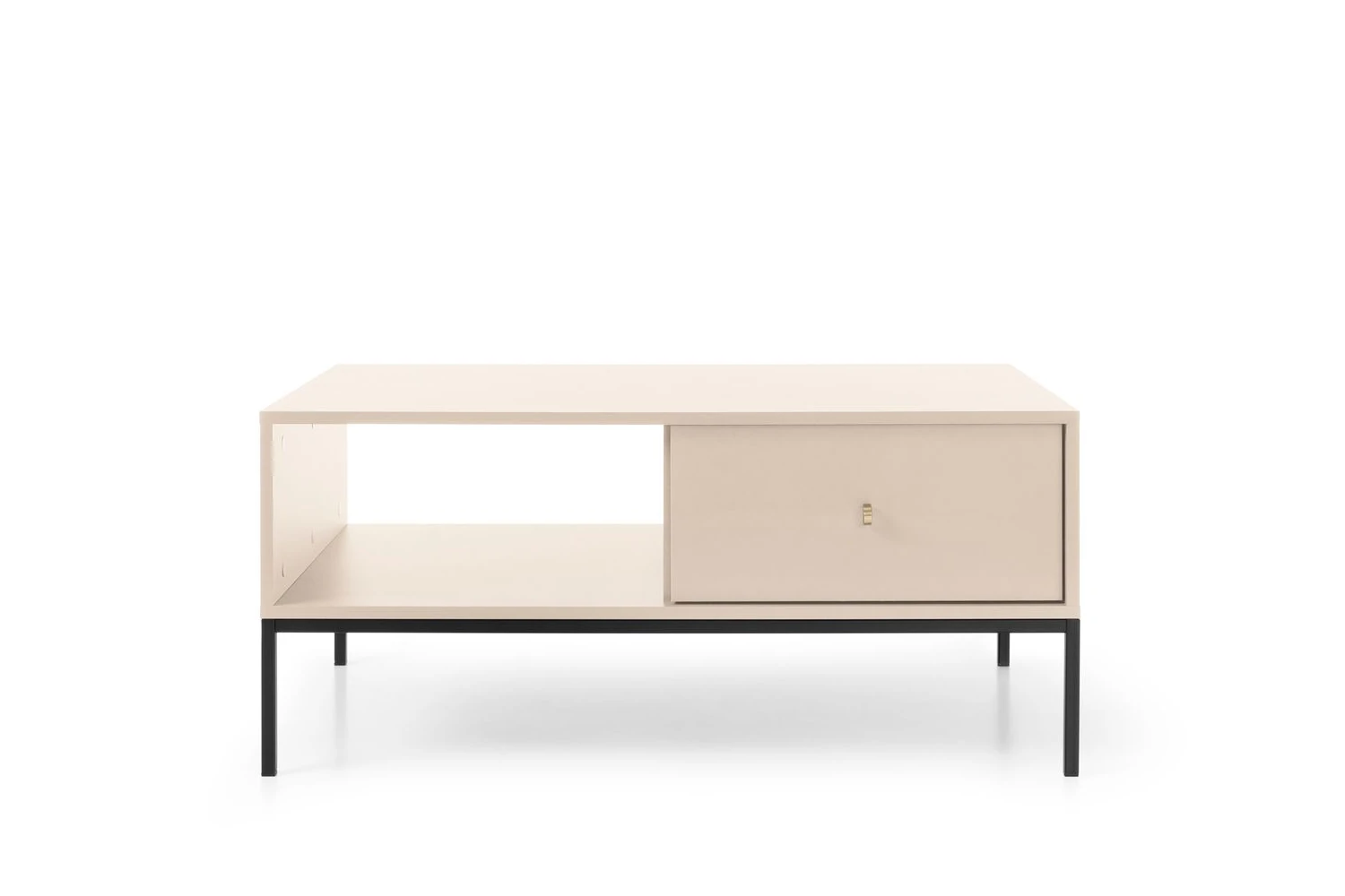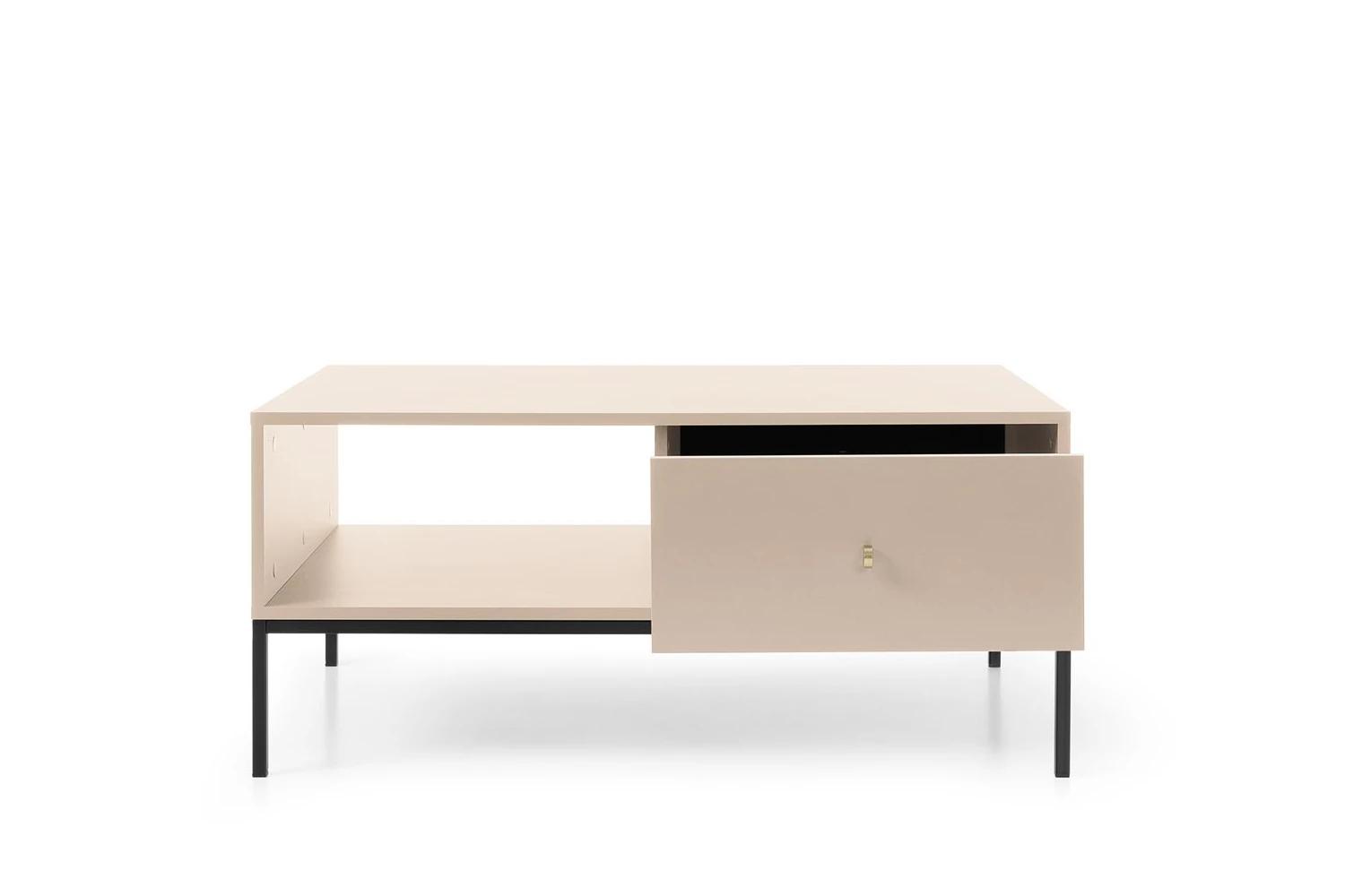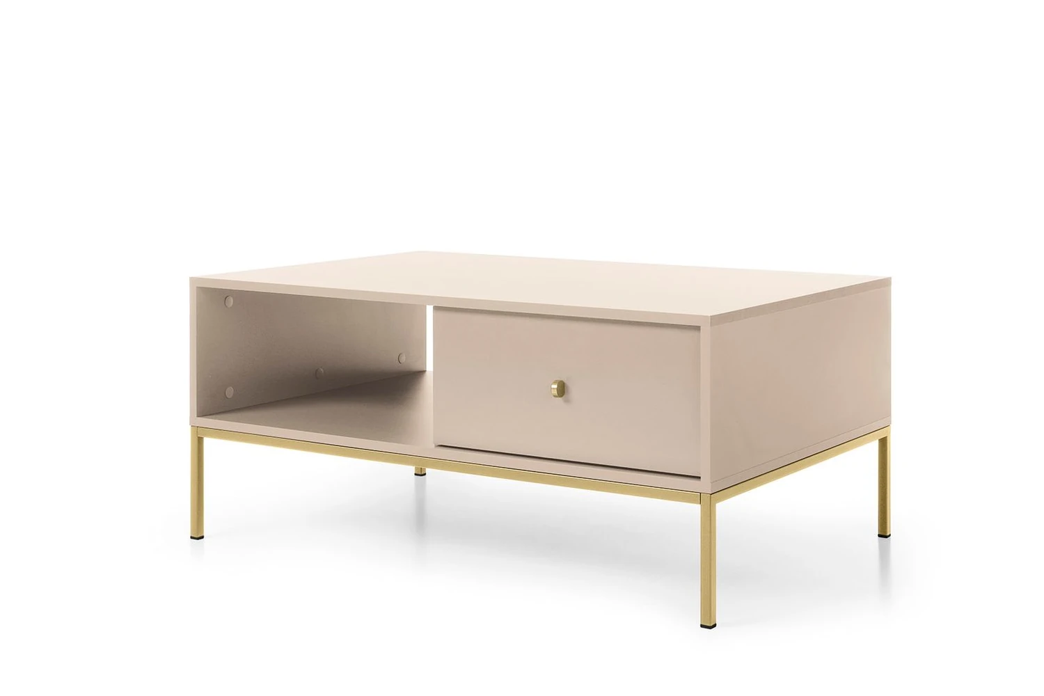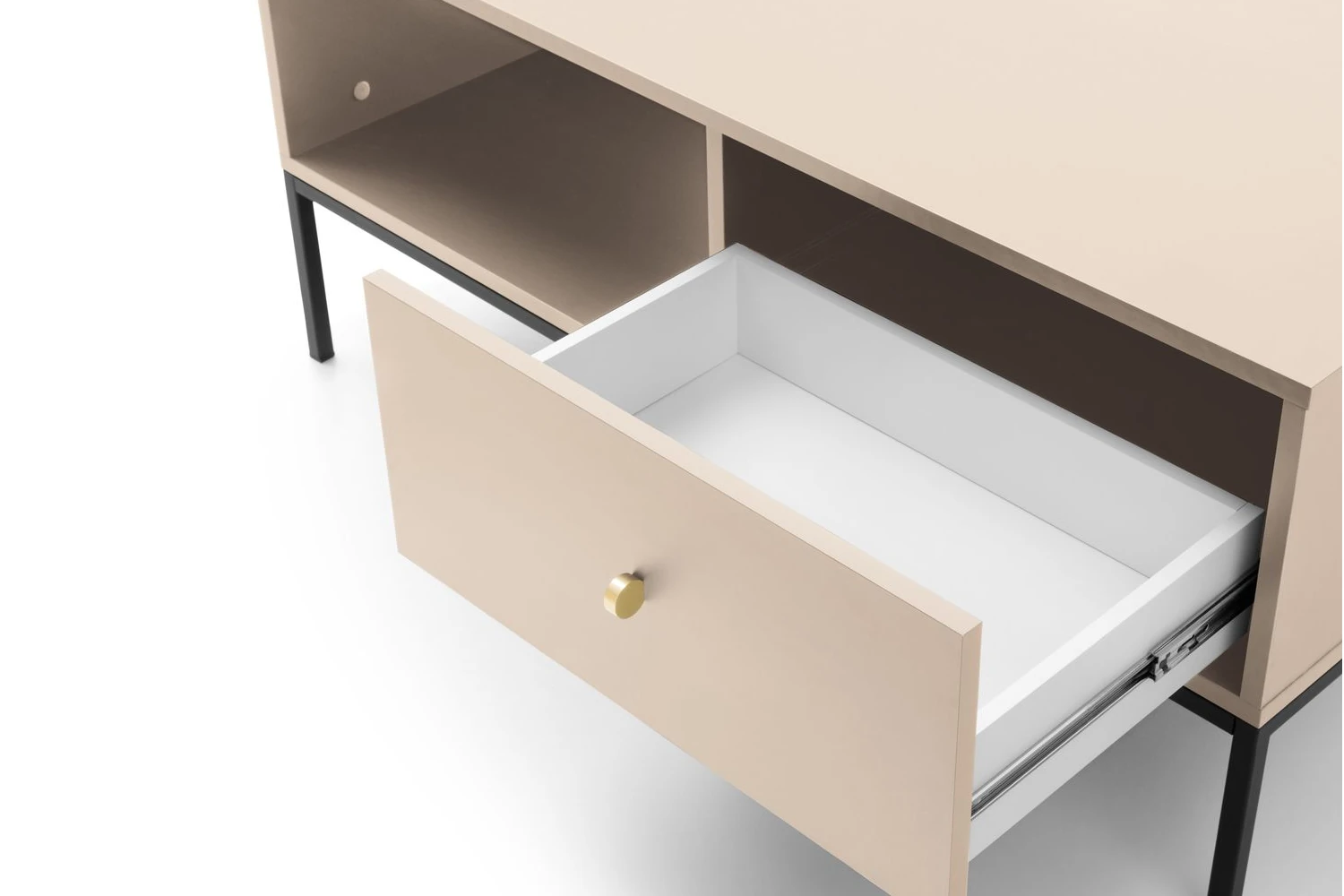 Stolik kawowy z szufladami do salonu Noli to elegancki i funkcjonalny element wyposażenia strefy wypoczynkowej. Mebel w subtelnym, piaskowym odcieniu wyróżnia się przemyślaną konstrukcją z szufladami i otwartą wnęką, co ułatwia organizację podręcznych drobiazgów. Możliwość wyboru koloru nóżek złotego lub czarnego pozwala na idealne dopasowanie stolika do stylu wnętrza, dodając mu nowoczesnego sznytu lub luksusowego charakteru glamour.