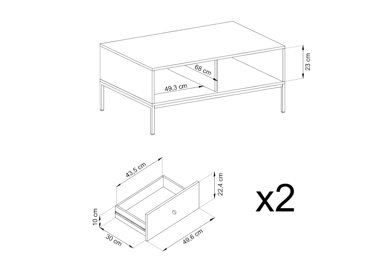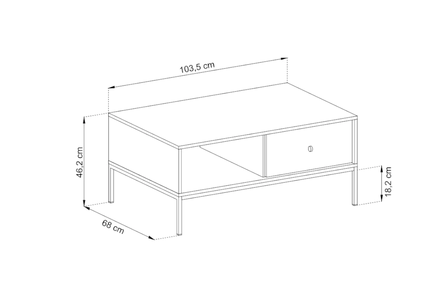 Stolik został zaprojektowany z myślą o maksymalnej wygodzie użytkowania. Wyposażony w pojemne szuflady oraz otwartą wnękę, oferuje mnóstwo miejsca na odłożenie pilotów, czasopism czy laptopa, pomagając utrzymać nienaganny porządek na blacie. Całość dopełniają eleganckie, podłużne uchwyty, które harmonizują z linią mebla i podkreślają jego nowoczesny, biżuteryjny charakter. Solidność i trwałość stolika gwarantuje wykonanie z wysokiej jakości płyty laminowanej. Wszystkie krawędzie zostały precyzyjnie zabezpieczone obrzeżem ABS, co znacząco podnosi odporność mebla na wilgoć, zarysowania oraz codzienne użytkowanie. Dzięki zastosowaniu materiałów odpornych na zużycie, stolik zachowuje swój estetyczny wygląd przez długie lata, będąc łatwym w codziennej pielęgnacji.