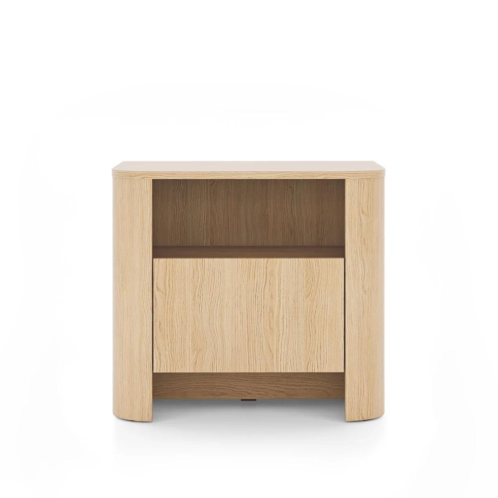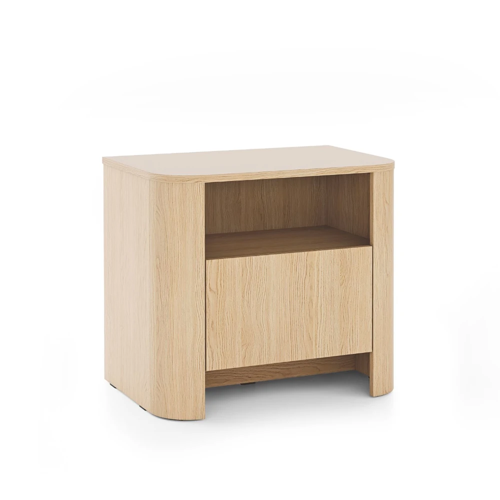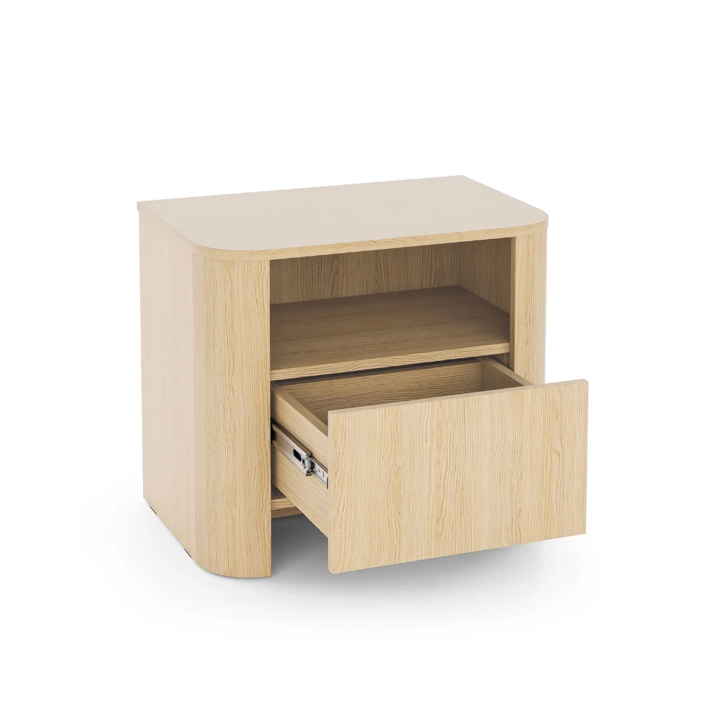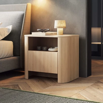 Stolik nocny Kairo z szufladą w kolorze Dąb Vicenza to praktyczna szafka nocna o zaokrąglonych bokach, z otwartą półką i pojemną szufladą na wszystkie niezbędne drobiazgi przy łóżku.