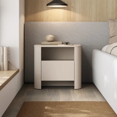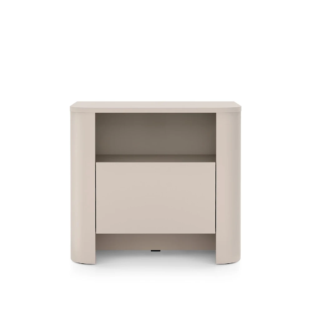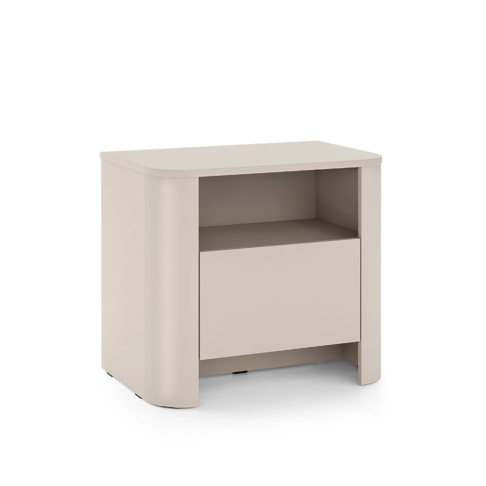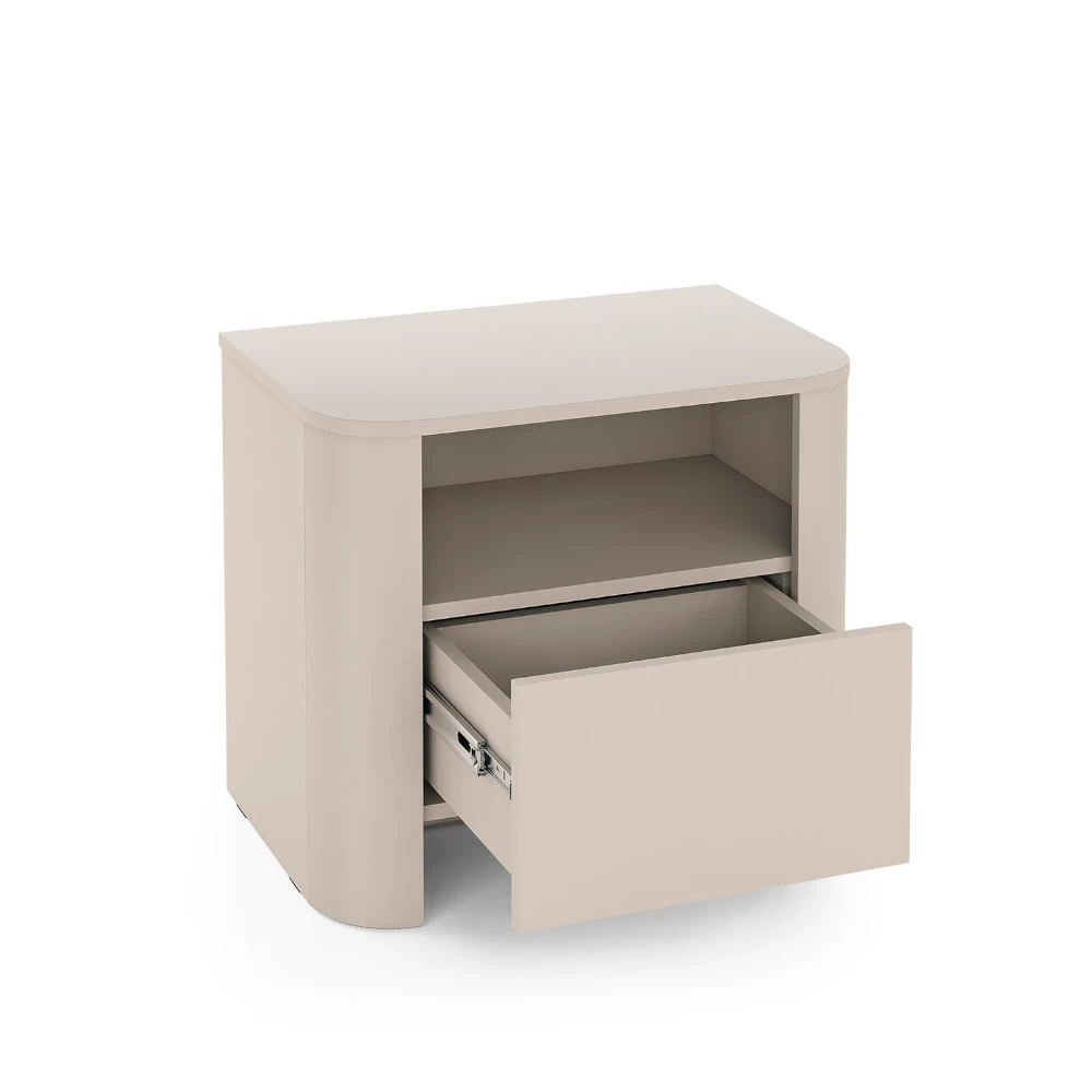 Stolik nocny Kairo z szufladą w kolorze kaszmirowym to elegancka szafka nocna, która łączy nowoczesne, obłe kształty z praktycznym miejscem na podręczne drobiazgi.