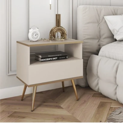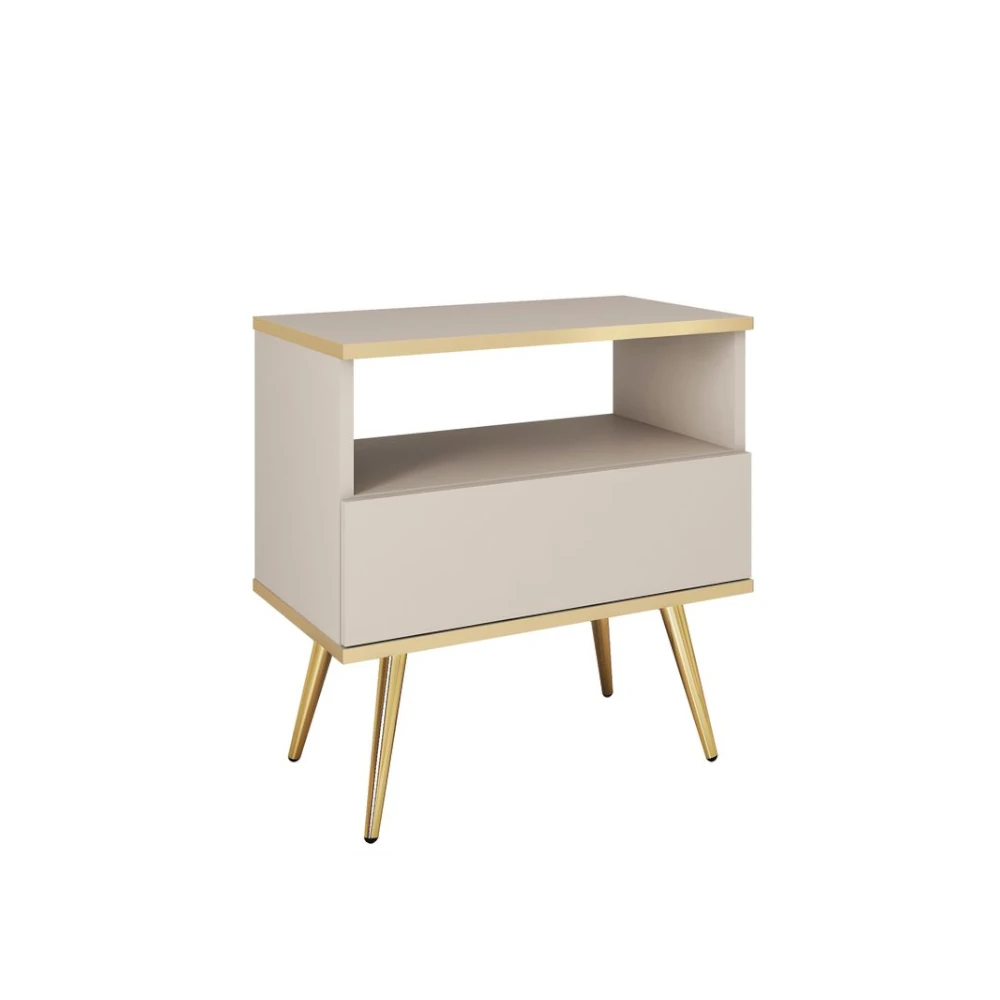 Stolik nocny Toro z szufladą to elegancki dodatek do sypialni, łączący prostą formę z luksusowym wykończeniem. Otwarta półka, pojemna szuflada oraz subtelne złote akcenty i smukłe nogi tworzą funkcjonalny i stylowy mebel.