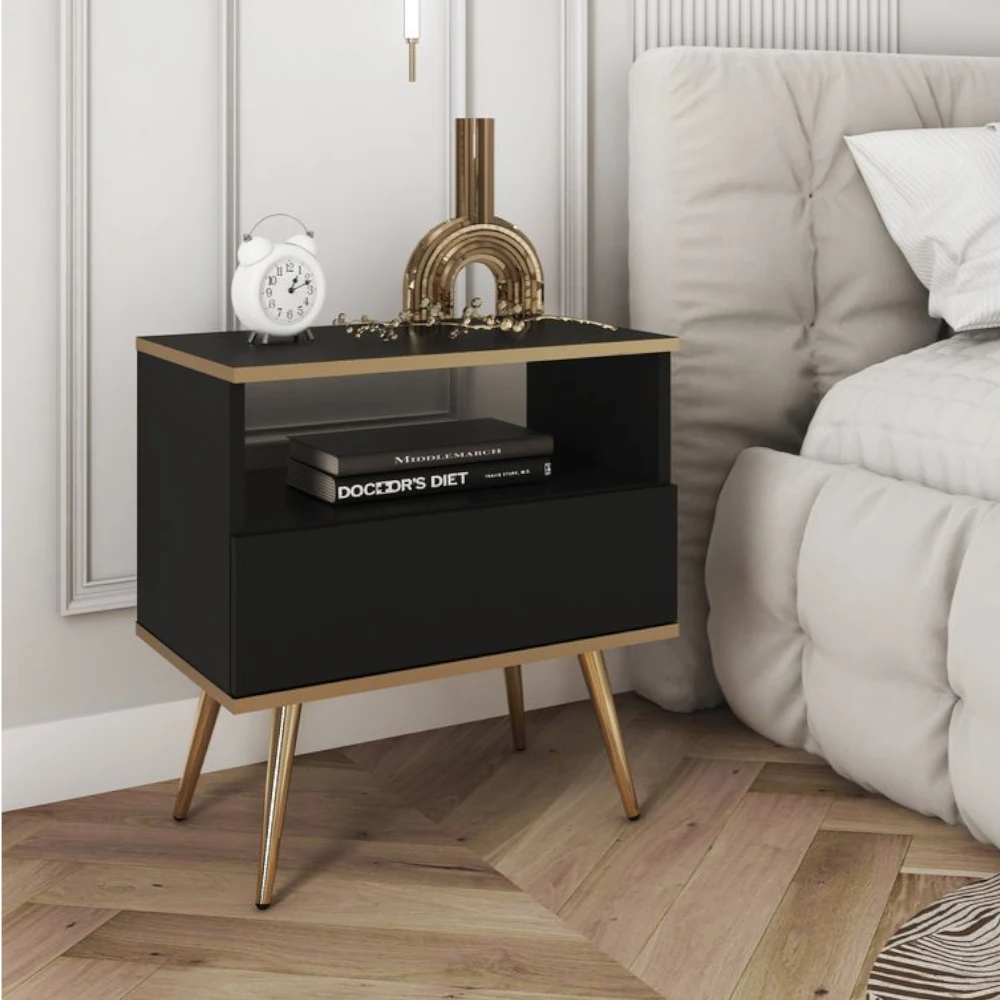 Stolik nocny Toro z szufladą to elegancki dodatek do sypialni, łączący prostą formę z luksusowym wykończeniem. Otwarta półka, pojemna szuflada oraz subtelne złote akcenty i smukłe nogi tworzą funkcjonalny i stylowy mebel.