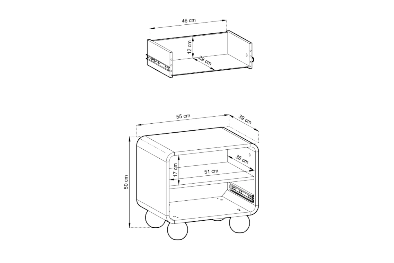 Ten stojący stolik nocny o szerokości 55 cm i wysokości 50 cm został zaprojektowany z myślą o maksymalnej wygodzie podczas wieczornego i porannego wypoczynku. Konstrukcja oferuje dwupoziomowe przechowywanie. Górna, otwarta wnęka to idealne miejsce na odłożenie telefonu, okularów czy czytanej właśnie książki. Z kolei dolna przestrzeń to pojemna szuflada, która pozwala ukryć osobiste drobiazgi i utrzymać nienaganny porządek wokół łóżka. W projekcie zrezygnowano z klasycznych uchwytów, co pozwoliło zachować idealnie gładki i minimalistyczny front. Szuflada otwiera się za pomocą nowoczesnego systemu push-to-open - wystarczy lekkie naciśnięcie powierzchni, aby uzyskać dostęp do wnętrza. Za płynny i stabilny ruch odpowiadają solidne prowadnice kulkowe z pełnym wysuwem.