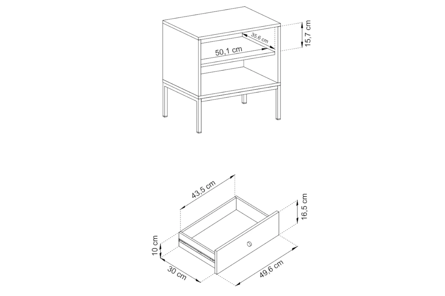 Mebel został zaprojektowany z myślą o maksymalnej funkcjonalności przy zachowaniu kompaktowych wymiarów. Stolik posiada pojemną szufladę na przedmioty, które chcesz mieć zawsze pod ręką, oraz otwartą wnękę idealną na odłożenie książki czy telefonu. Całość dopełnia minimalistyczny uchwyt w kolorze złotym, który zapewnia komfortowe użytkowanie i podkreśla elegancki profil mebla. Trwałość i estetykę wykonania zapewnia wysokiej jakości płyta laminowana. Krawędzie stolika zostały precyzyjnie zabezpieczone obrzeżem ABS, co gwarantuje odporność na przypadkowe uderzenia, wilgoć oraz codzienne użytkowanie. Dzięki gładkiej strukturze mebel jest niezwykle łatwy w pielęgnacji, zachowując swój nienaganny wygląd przez długie lata.