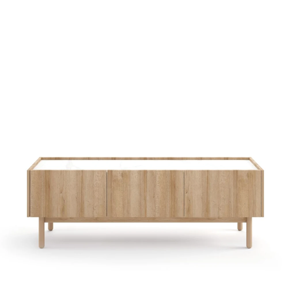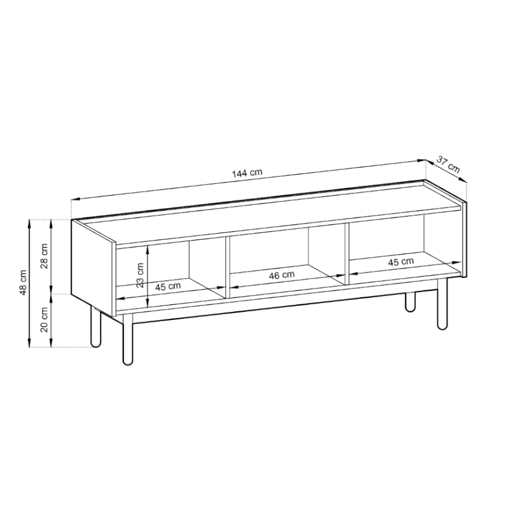 Szafka RTV 144 cm Tavro dąb Riviera została zaprojektowana z myślą o nowoczesnych salonach, w których liczy się lekkość formy i funkcjonalność. Prosta bryła oparta na wysokich, okrągłych nogach prezentuje się subtelnie i nie przytłacza przestrzeni, a wybarwienie dąb Riviera ociepla aranżację i wprowadza przytulny, naturalny klimat.