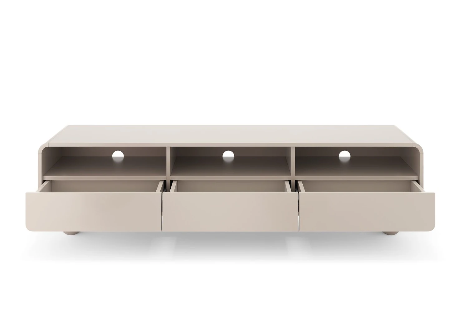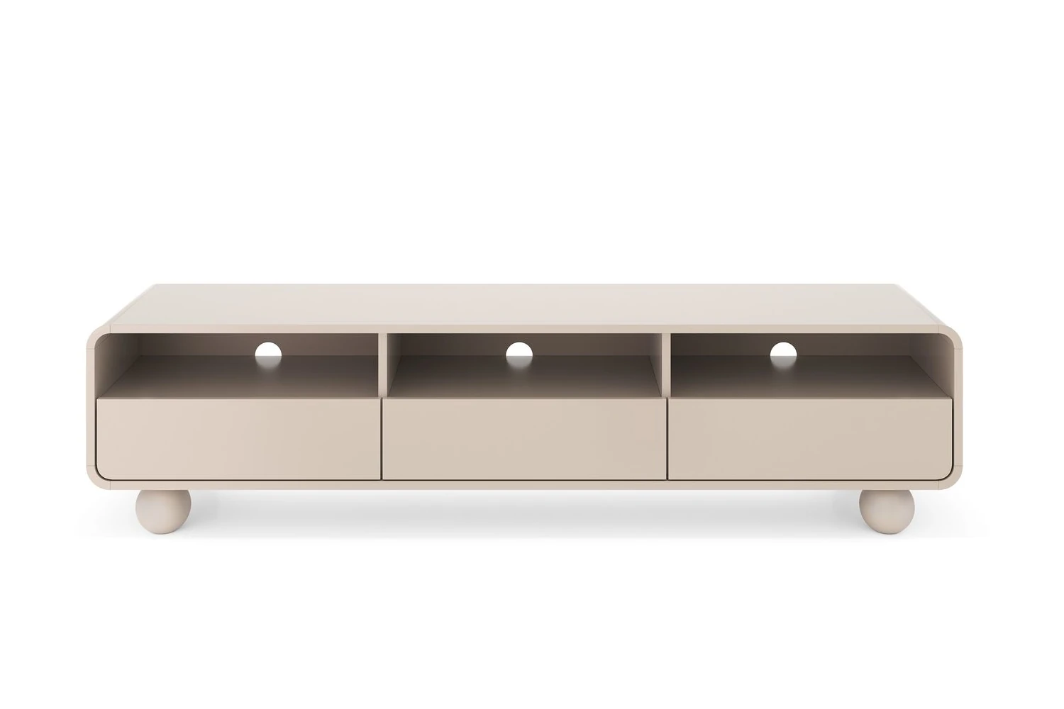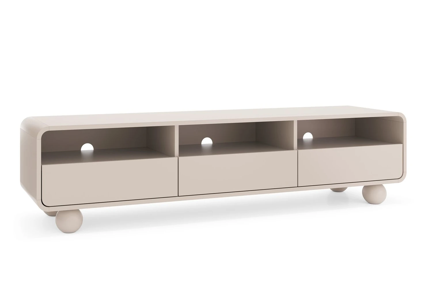 Szafka RTV 180cm z kulistymi nóżkami Bubo to wyjątkowy mebel do salonu, który łączy nowoczesny minimalizm z przytulnym, ciepłym designem. Wykończona w niezwykle modnym odcieniu kaszmiru, przyciąga wzrok łagodnie zaokrąglonymi krawędziami oraz oryginalnymi, okrągłymi nóżkami. Mebel oferuje aż trzy otwarte wnęki z otworami na kable oraz trzy pojemne szuflady z bezuchwytowym systemem push-to-open, tworząc idealną i niezwykle funkcjonalną bazę pod domowe centrum rozrywki.