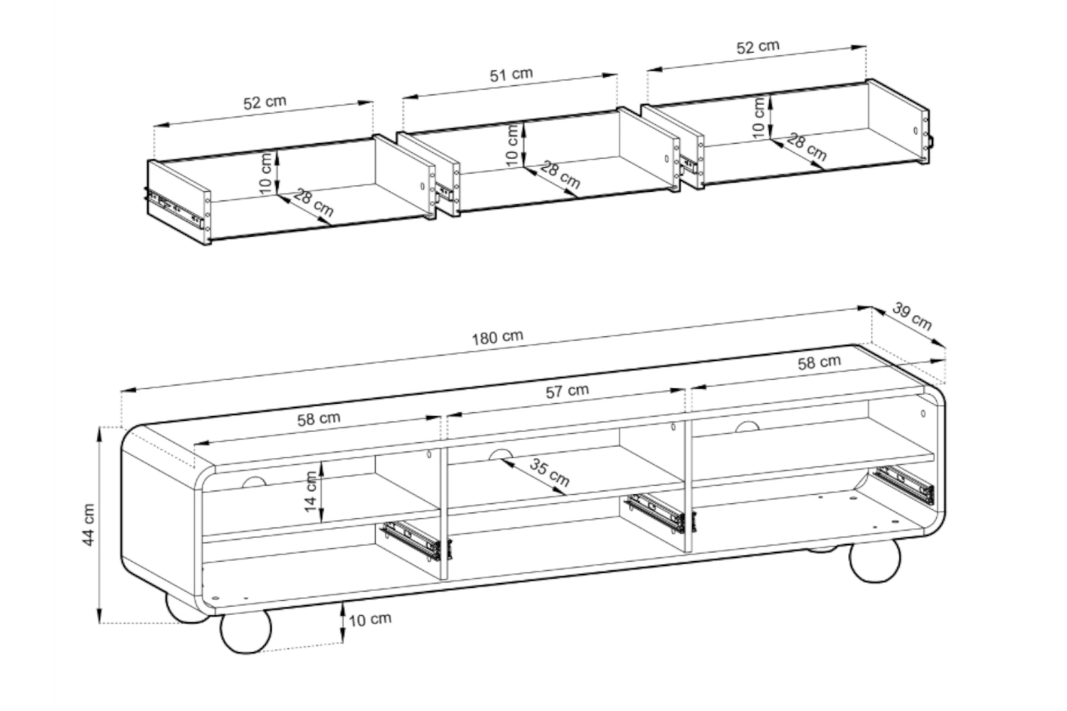 Ten stojący mebel o pokaźnej szerokości 180 cm i wysokości 44 cm został zaprojektowany tak, aby pomieścić nawet duże ekrany i okalający je sprzęt. Górna część szafki skrywa trzy otwarte wnęki, które są idealnym miejscem na dekoder, konsolę do gier czy system audio. Co niezwykle ważne dla estetyki salonu, każda z tych wnęk posiada w plecach dedykowany otwór na kable, co pozwala raz na zawsze zapomnieć o plątaninie przewodów. Dolną część przestrzeni zajmują trzy pojemne szuflady, w których ukryjesz kolekcję filmów, gier, zapasowe kable i inne salonowe drobiazgi. Dla zachowania idealnie gładkiej, minimalistycznej formy zrezygnowano z klasycznych uchwytów. Szuflady otwierają się za pomocą nowoczesnego systemu push-to-open - wystarczy delikatnie docisnąć front. Za płynny ruch i bezproblemowy dostęp do całej zawartości odpowiadają solidne prowadnice kulkowe z pełnym wysuwem.