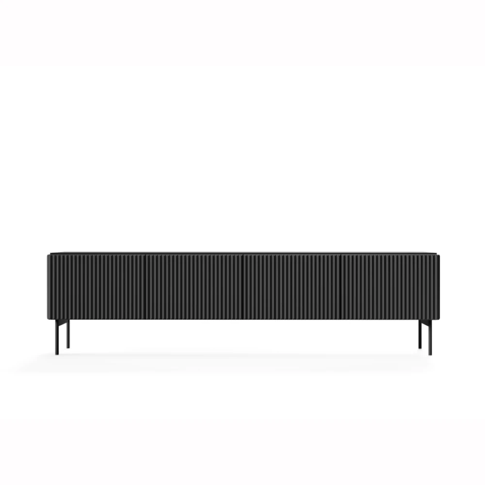 Szafka RTV 195 cm czterodrzwiowa ryflowana Rillo czarna to nowoczesny, minimalistyczny mebel idealny pod duży telewizor. Czarny, ryflowany front z płyty MDF oraz wysokie metalowe nóżki nadają jej elegancki, loftowy charakter, a cztery pojemne komory za drzwiami typu push-to-open zapewniają dużo miejsca na sprzęt RTV i akcesoria.