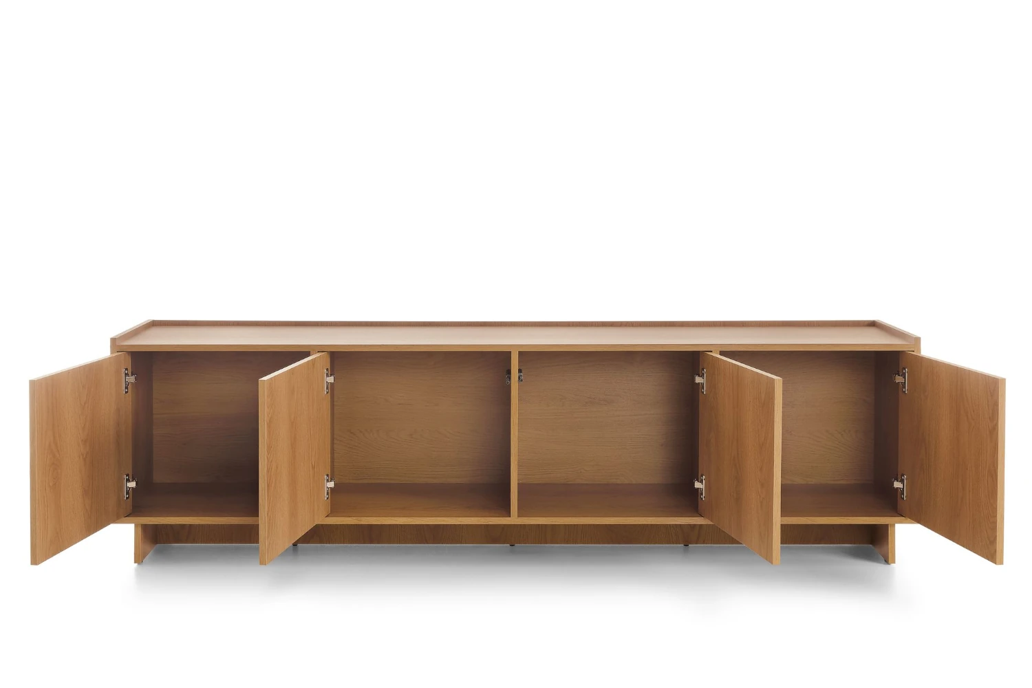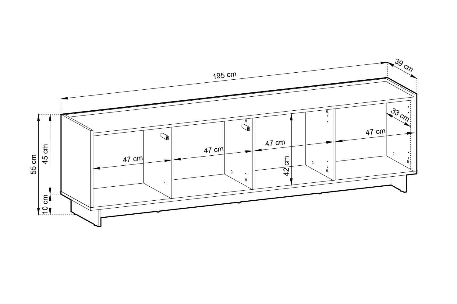 Wyjątkowym atutem tego modelu jest jego przemyślana konstrukcja. Szafka została wyposażona w cztery pojemne szafki, których wnętrze zostało zaprojektowane bez dodatkowych półek. Takie rozwiązanie zapewnia maksymalną elastyczność i pozwala na przechowywanie większych przedmiotów, takich jak wysokie kolumny audio, pokaźna kolekcja winyli czy sprzęt multimedialny o niestandardowych wymiarach. Dostęp do zawartości jest niezwykle komfortowy dzięki nowoczesnemu systemowi push to open - wystarczy lekki nacisk na front, aby drzwi otworzyły się bezszelestnie. Mebel wykonano z najwyższej jakości płyty laminowanej, co gwarantuje stabilność nawet przy dużym obciążeniu blatu. Krawędzie zostały zabezpieczone obrzeżem ABS, chroniącym przed wilgocią i uszkodzeniami mechanicznymi. Spójność estetyczną zapewniają nogi wykonane z tej samej płyty laminowanej co korpus, dzięki czemu mebel tworzy jednolitą, harmonijną formę, która idealnie wpisuje się w stylistykę skandynawską, nowoczesną oraz loftową.