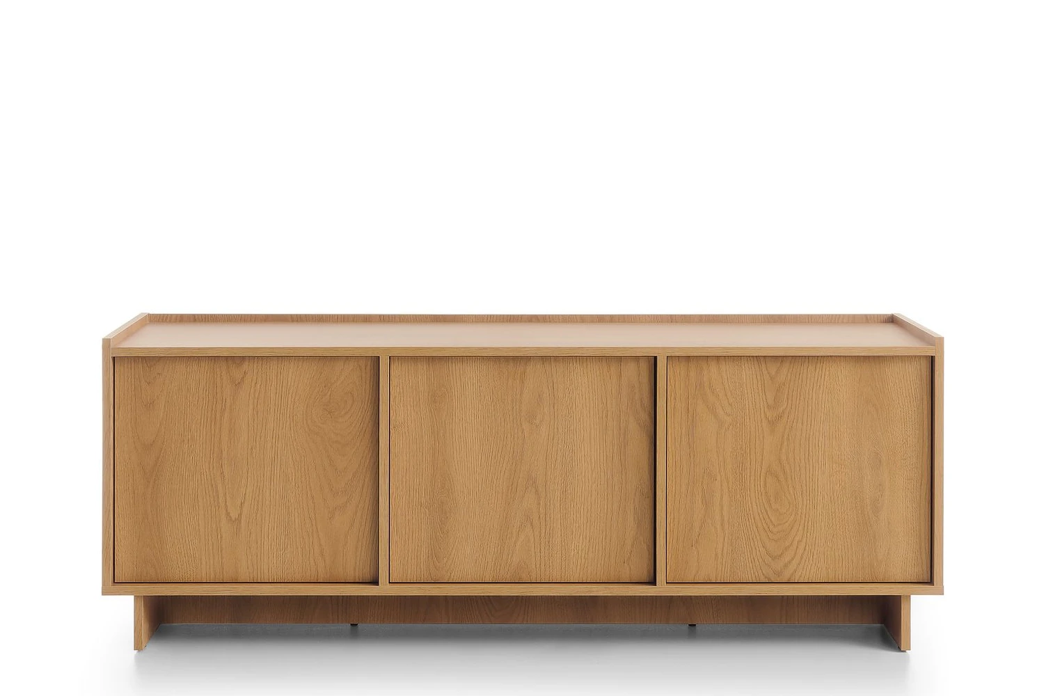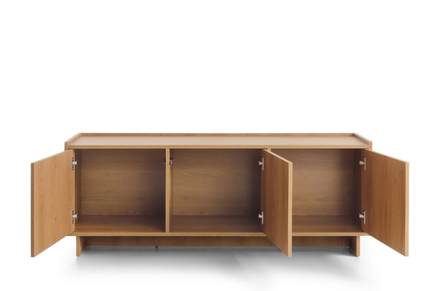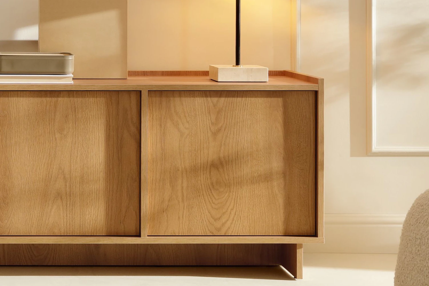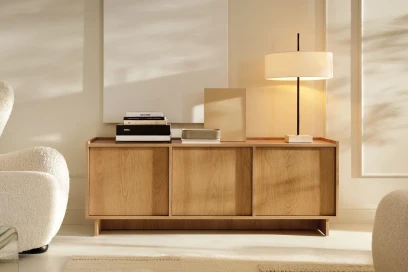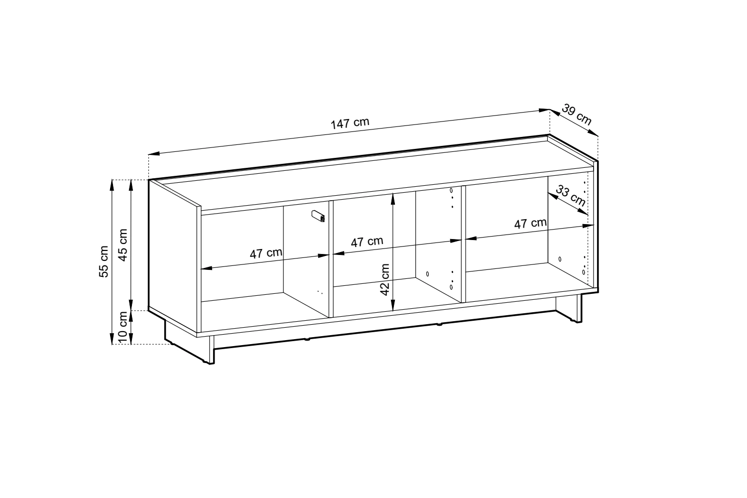 Projekt tego modelu stawia na pełną swobodę użytkowania. Szafka została wyposażona w trzy zamykane szafki, których wnętrze zostało zaprojektowane bez dodatkowych półek. Pozwala to na optymalne wykorzystanie dostępnego miejsca i bezproblemowe przechowywanie większych przedmiotów, takich jak odtwarzacze, kolekcje płyt czy akcesoria gamingowe. Nowoczesny komfort zapewnia system push to open - wystarczy lekkie naciśnięcie frontu, aby uzyskać szybki i wygodny dostęp do zawartości. Solidność i precyzja wykonania to cechy wyróżniające kolekcję Aranz. Szafka powstała z wysokiej jakości płyty laminowanej, a jej krawędzie zostały zabezpieczone obrzeżem ABS, co chroni mebel przed wilgocią i uszkodzeniami. Spójność stylistyczną podkreślają nogi wykonane z płyty laminowanej w kolorze dębu karmelowego. Takie rozwiązanie sprawia, że mebel tworzy jednolitą bryłę, która prezentuje się niezwykle lekko, a jednocześnie stabilnie.