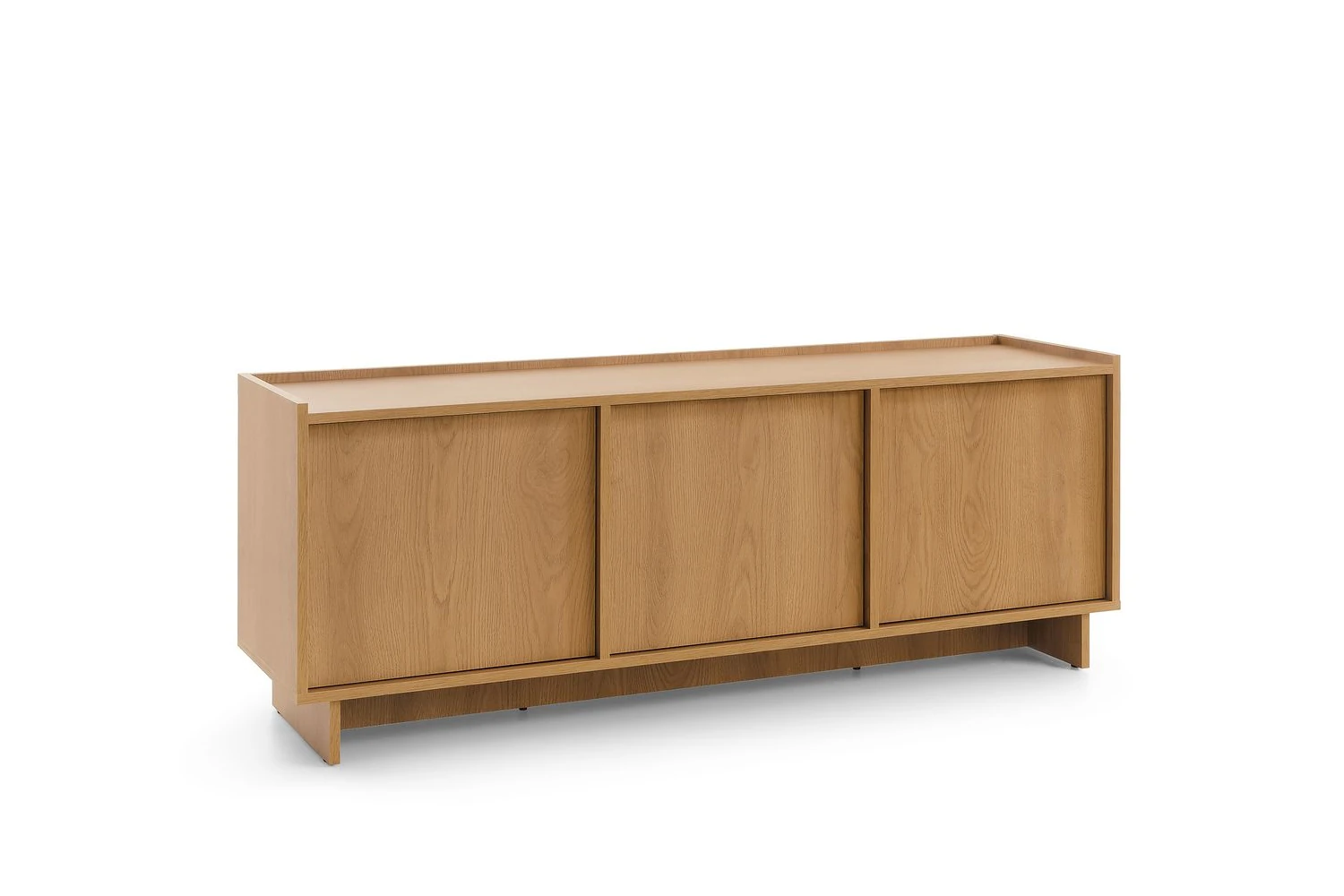 Szafka RTV trzydrzwiowa Aranz 147cm to idealne rozwiązanie dla osób poszukujących funkcjonalnego i stylowego mebla pod telewizor o średniej wielkości. Ciepły odcień dębu karmelowego w połączeniu z minimalistyczną formą bez klasycznych uchwytów tworzy spójną i nowoczesną całość. Dzięki systemowi push-to-open oraz wnętrzu bez dodatkowych półek, mebel oferuje maksymalną swobodę przechowywania sprzętu RTV i domowych akcesoriów, zachowując przy tym lekki i naturalny wygląd.