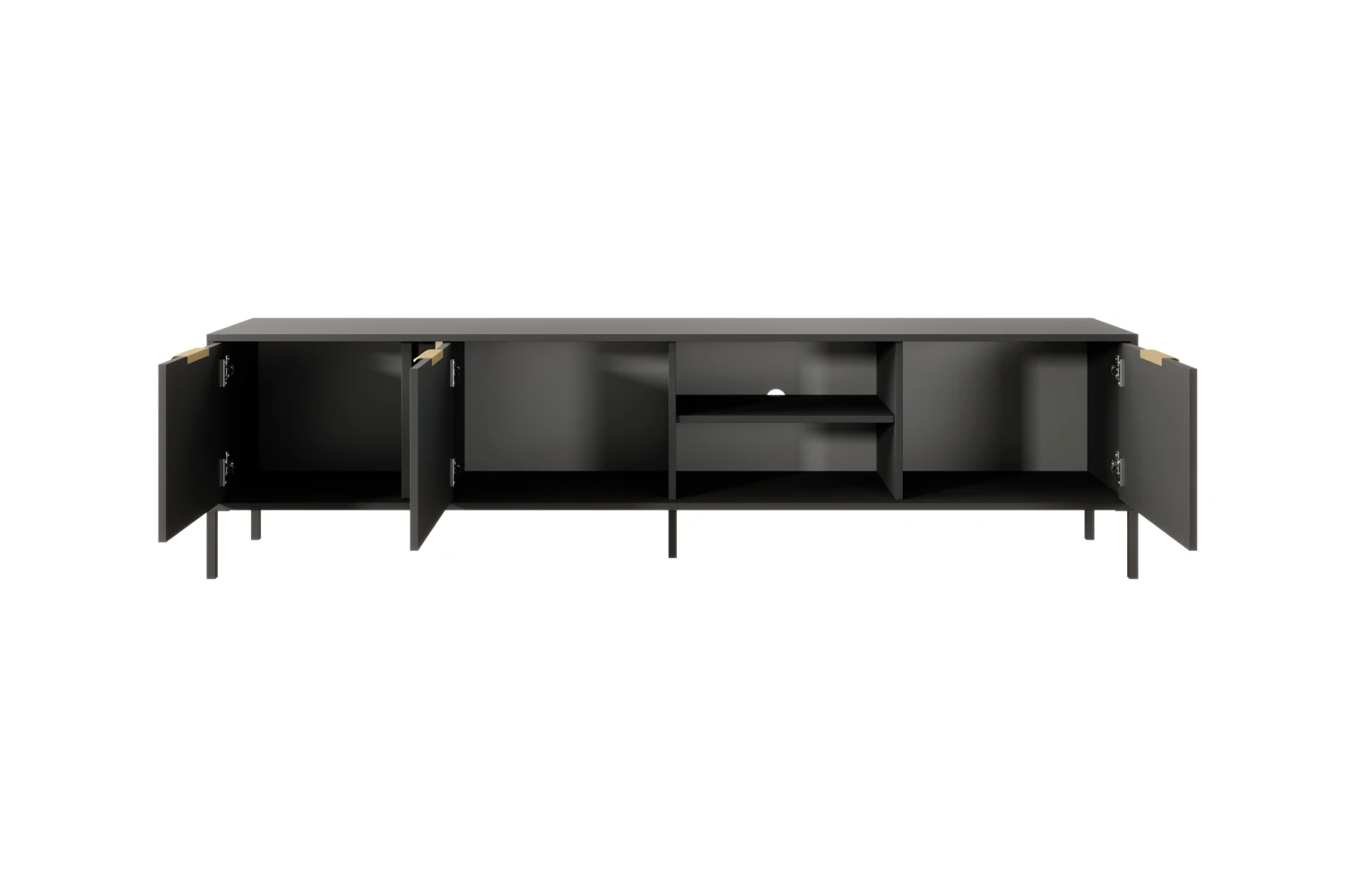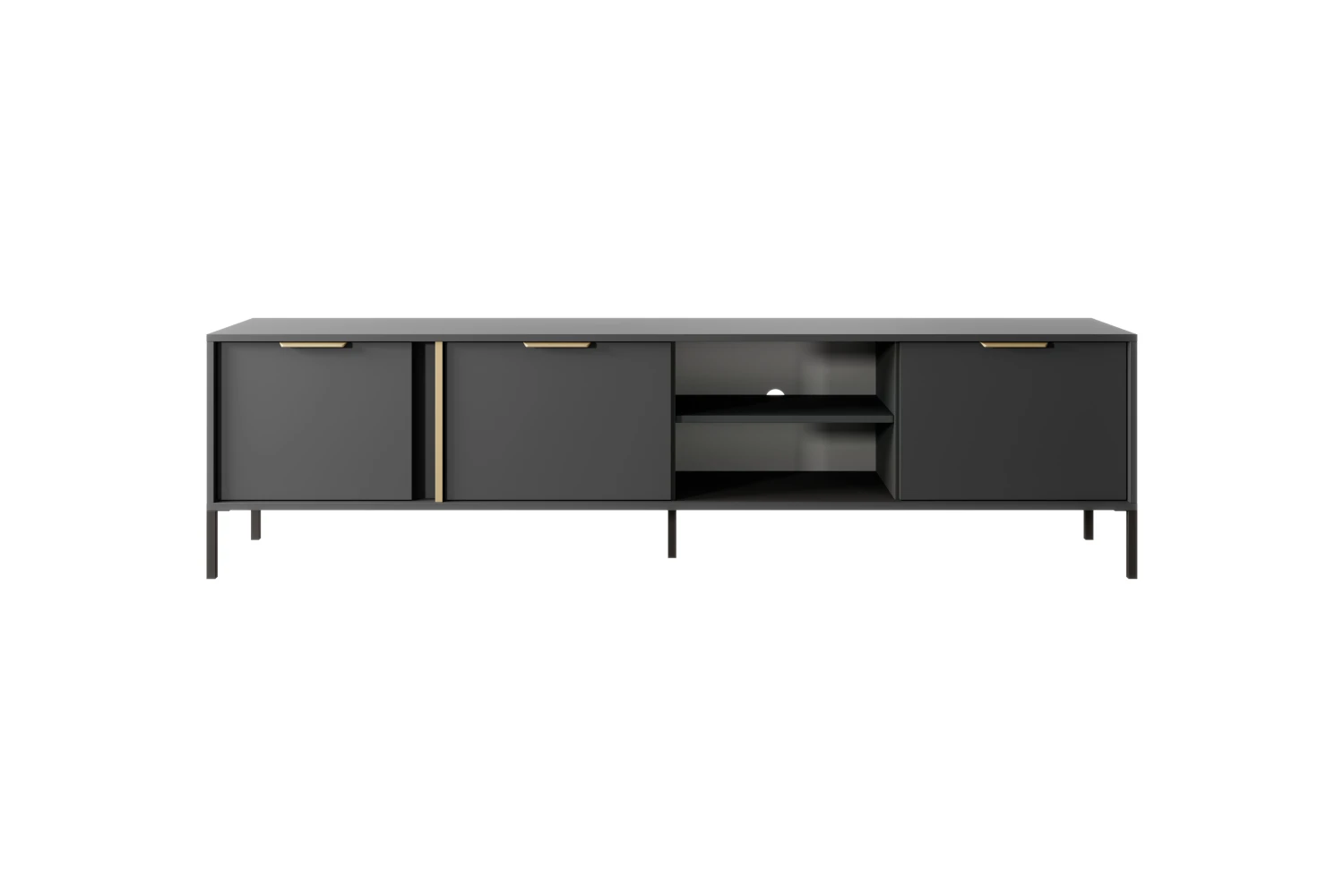Szafka RTV trzydrzwiowa Axis to funkcjonalne centrum multimedialne, stworzone z myślą o nowoczesnych wnętrzach. Matowe czarne fronty, smukłe metalowe nogi oraz złote uchwyty nadają jej luksusowego, a jednocześnie ponadczasowego charakteru.