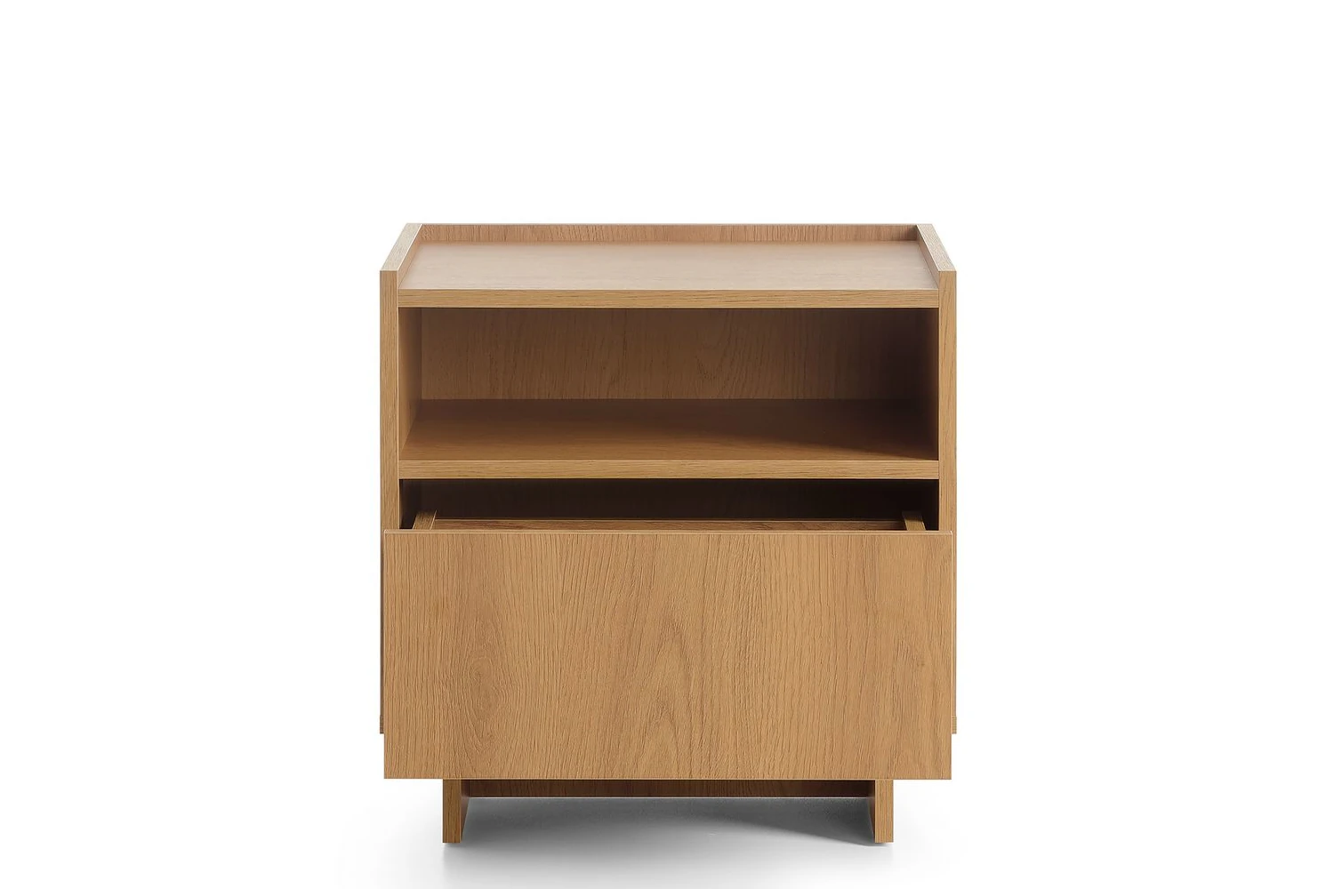 Konstrukcja mebla została zaprojektowana tak, aby tworzyć jednolitą, harmonijną całość. Zarówno korpus, jak i nogi wykonane z płyty laminowanej utrzymane są w tym samym, ciepłym wybarwieniu dębu karmelowego. Taka stylistyka sprawia, że szafka prezentuje się bardzo naturalnie, wprowadzając do strefy wypoczynku przytulny, niemal skandynawski klimat, zachowując przy tym swoją funkcjonalność dzięki pojemnej szufladzie oraz dodatkowej otwartej wnęce na książki czy telefon. Wysoką jakość i stabilność mebla gwarantuje wykorzystanie płyty laminowanej. Każdy element został starannie dopracowany, a krawędzie zabezpieczono trwałym obrzeżem ABS, chroniącym przed wilgocią oraz uszkodzeniami mechanicznymi. Dzięki rezygnacji z metalowych okuć na zewnątrz, mebel jest łatwiejszy w czyszczeniu i bezpieczniejszy, a jego solidna podstawa z płyty zapewnia pewne oparcie na każdym rodzaju podłogi.