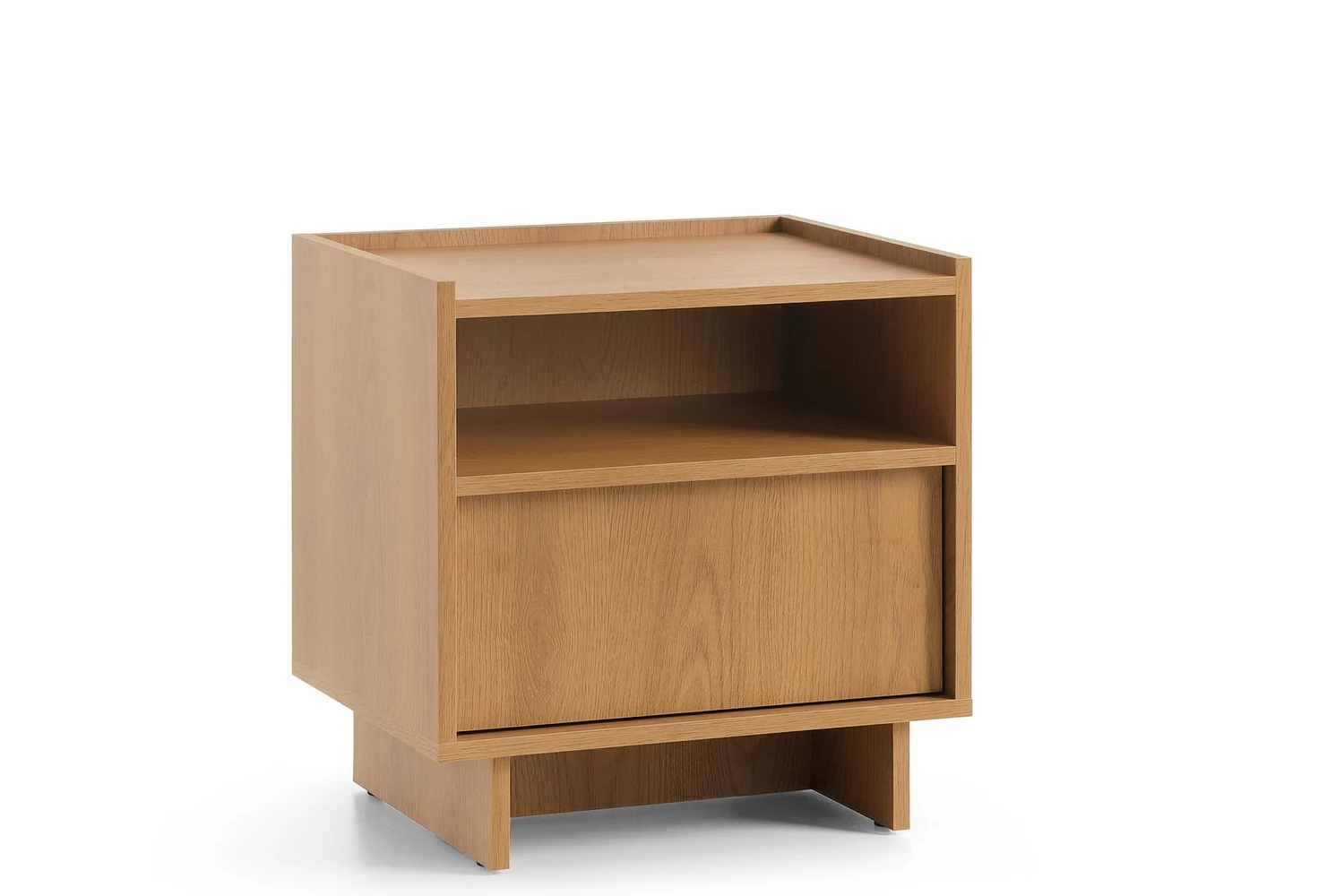 Szafka nocna z szufladą Aranz to stylowy mebel o jednolitej, ciepłej kolorystyce, który wnosi do sypialni naturalny urok. Wykonana w całości z wysokiej jakości płyty laminowanej, włącznie z solidnymi nogami w tym samym odcieniu, prezentuje się niezwykle spójnie i elegancko. Praktyczne połączenie zamykanej szuflady oraz otwartej wnęki pozwala na wygodne przechowywanie podręcznych drobiazgów, tworząc harmonijne dopełnienie nowoczesnej i przytulnej strefy wypoczynku.
