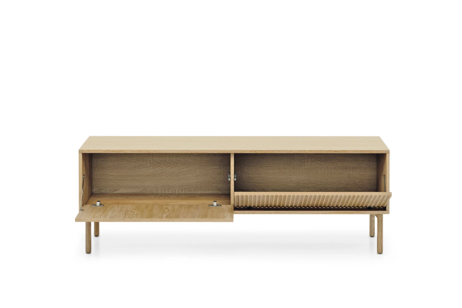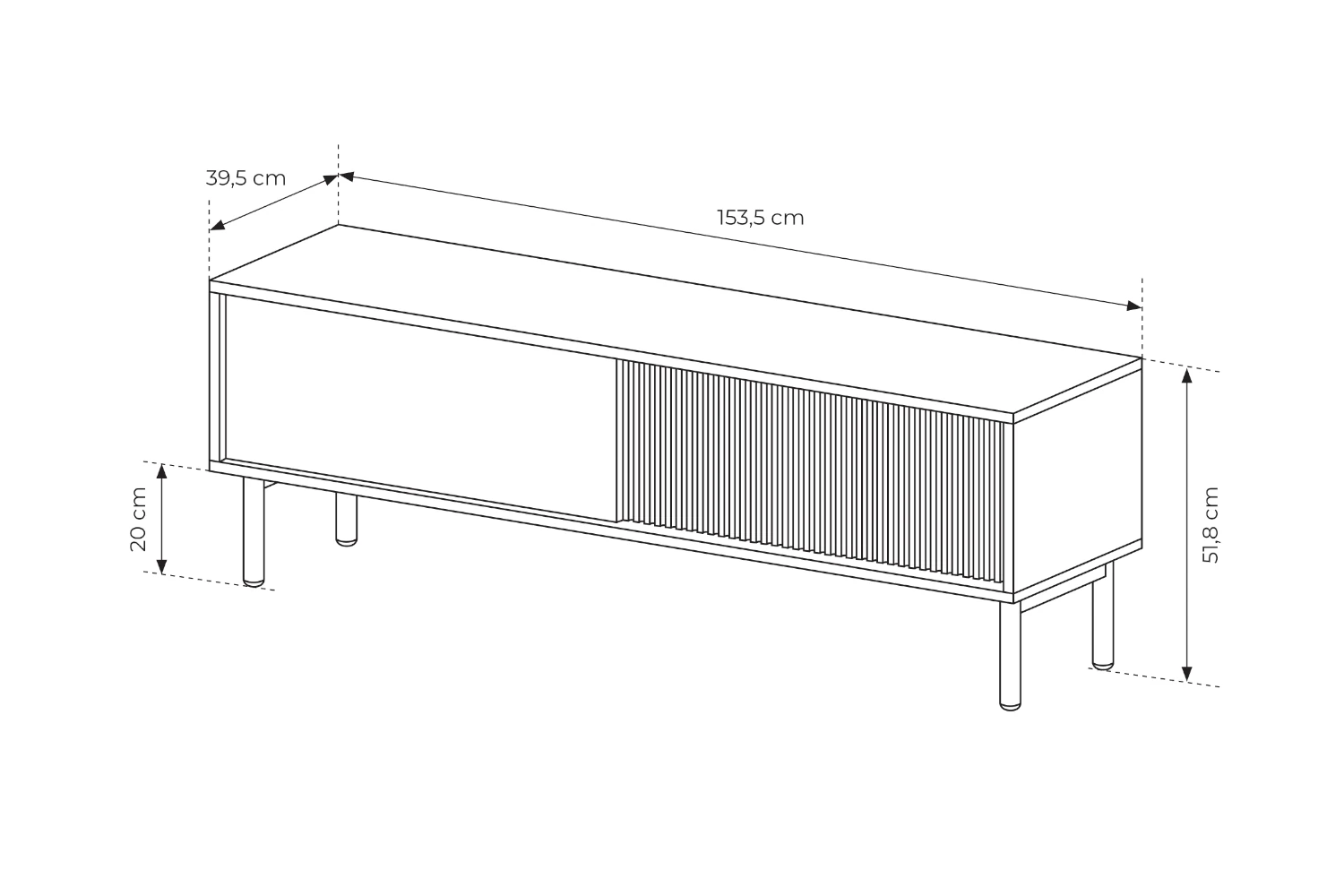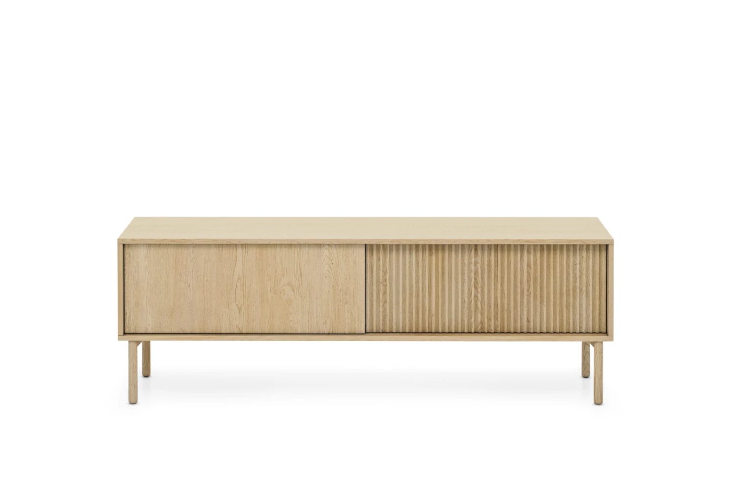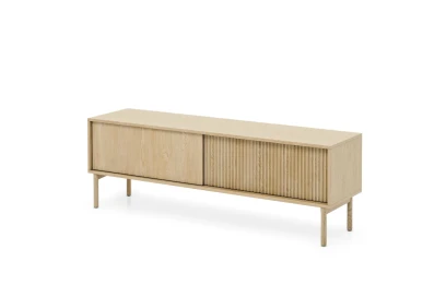 Szafka pod telewizor Nore 153 cm Dąb Cremona została zaprojektowana z myślą o nowoczesnych, jasnych wnętrzach. Połączenie naturalnego dekoru dębu z pionowo ryflowanym frontem tworzy elegancki, a jednocześnie bardzo przytulny efekt. Smukłe drewniane nogi nadają bryle lekkości i ułatwiają utrzymanie porządku pod meblem.
