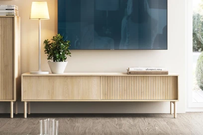 Mebel doskonale sprawdzi się jako szafka RTV do salonu. Szeroki blat pomieści telewizor oraz dekoracje, a pojemne zamykane przestrzenie przechowają sprzęt multimedialny, gry, płyty lub drobne akcesoria. Dzięki systemowi push-to-open fronty otwierają się po lekkim naciśnięciu, co pozwoliło zrezygnować z uchwytów i zachować czystą, nowoczesną linię mebla.