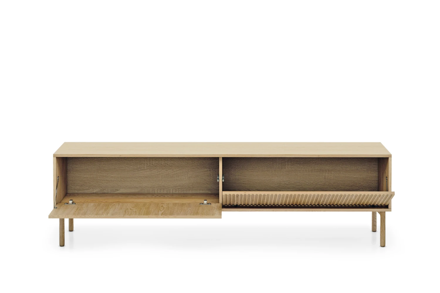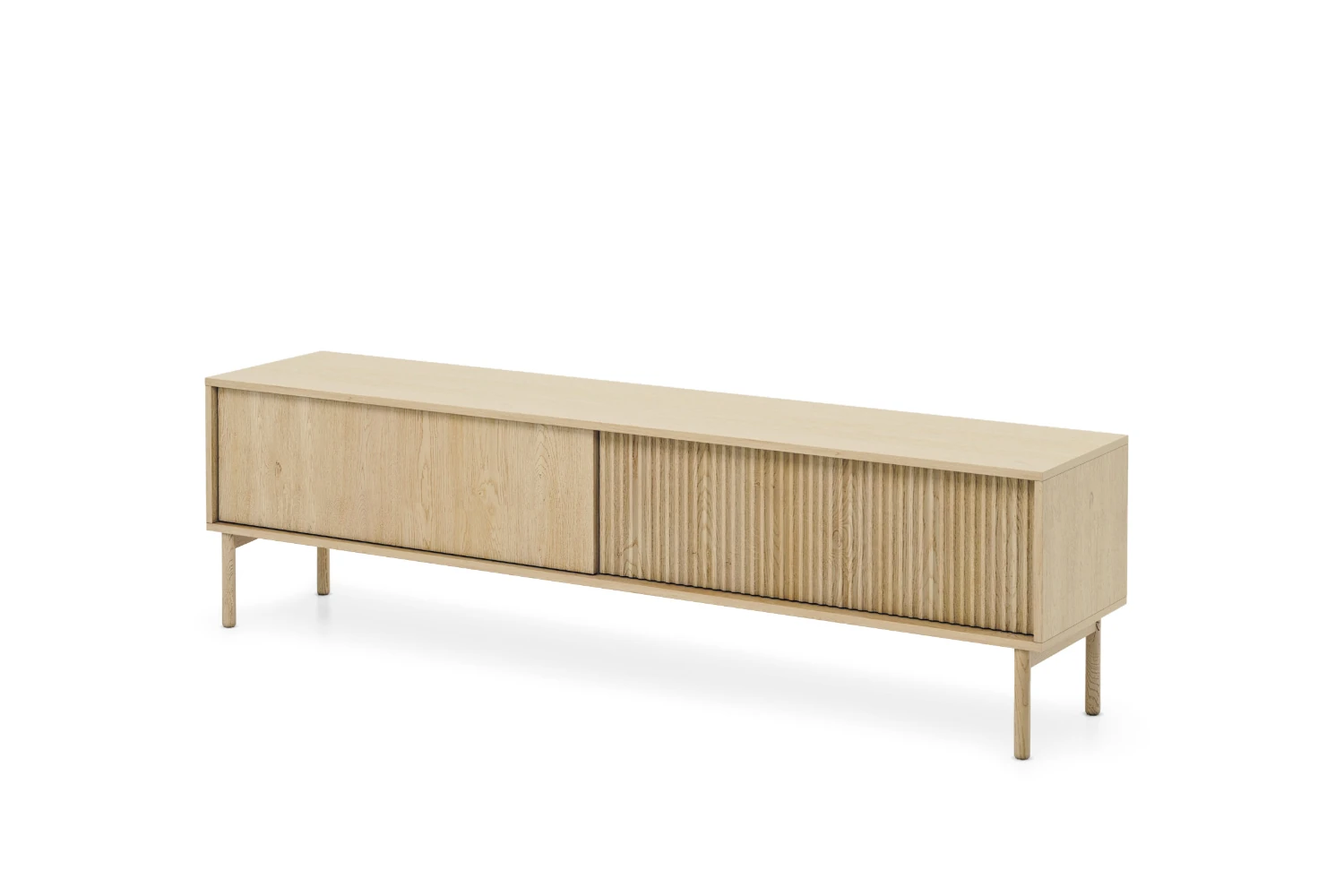 Szafka pod telewizor Nore 187 cm Dąb Cremona została zaprojektowana z myślą o nowoczesnych, jasnych wnętrzach. Połączenie naturalnego dekoru dębu z pionowo ryflowanym frontem tworzy elegancki, a jednocześnie bardzo przytulny efekt. Smukłe drewniane nogi nadają bryle lekkości i ułatwiają utrzymanie porządku pod meblem.