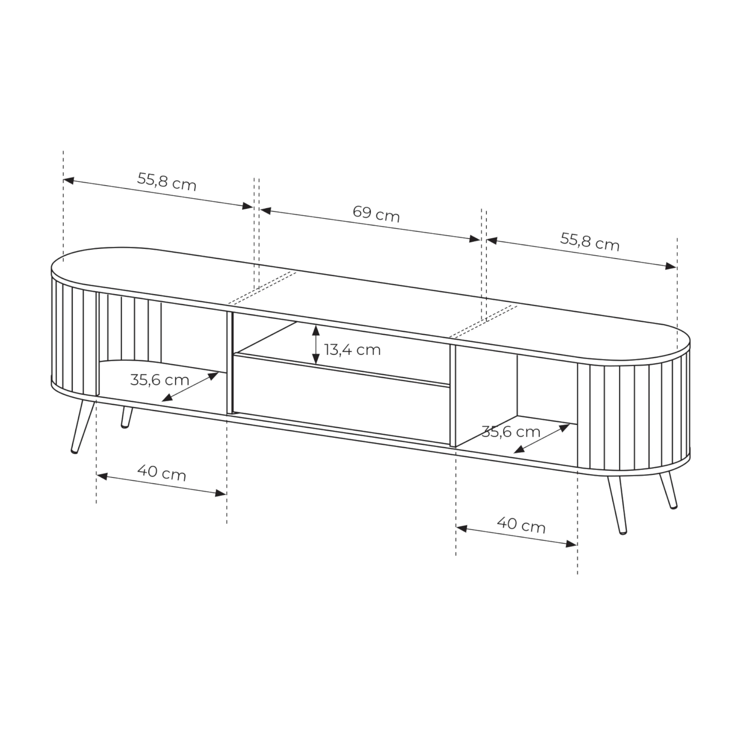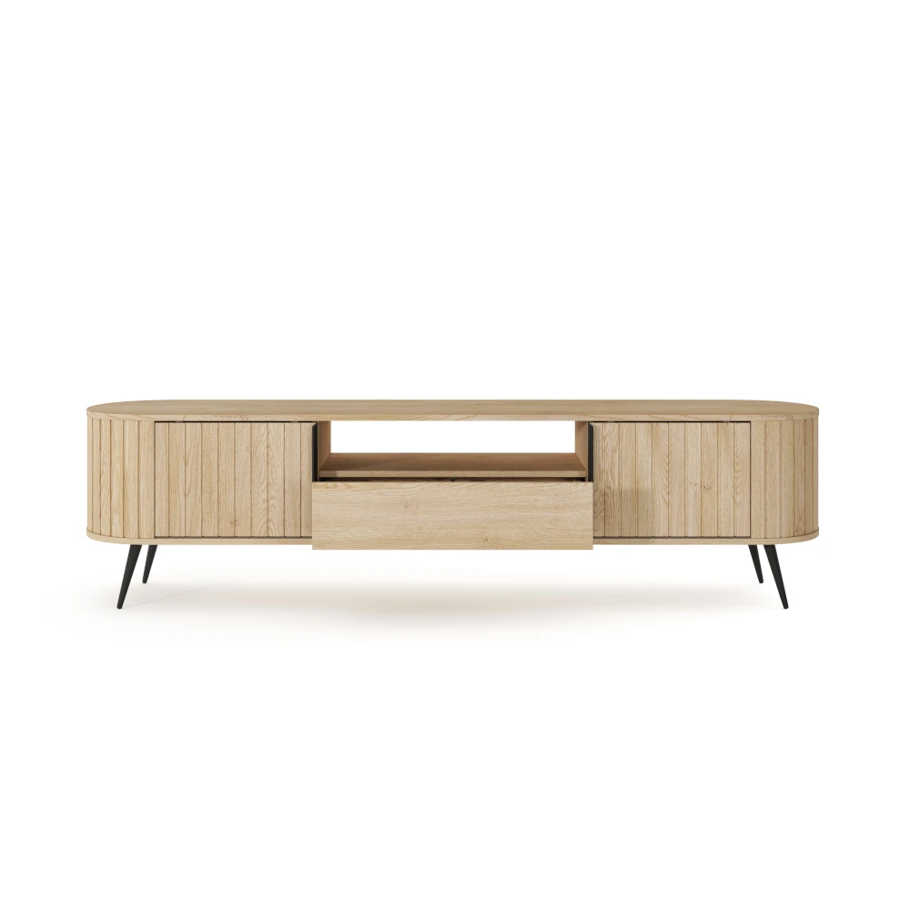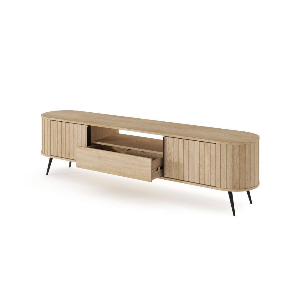 Dwie zamykane wnęki po bokach pomieszczą filmy, gry i akcesoria, a otwarta półka środkowa jest idealna na dekoder lub konsole. Pojemna szuflada na prowadnicach kulkowych z pełnym wysuwem ułatwia dostęp do przechowywanych rzeczy, a system przesuwnych frontów pozwala szybko zmieniać aranżację przestrzeni pod telewizorem.