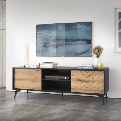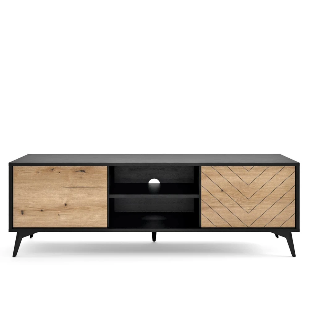Szafka pod telewizor Valmo z drzwiczkami to wyrazisty mebel RTV, który łączy czarny korpus z ciepłym dekorem drewna. Gładki lewy front i prawy front ozdobiony wzorem jodełki tworzą ciekawy kontrast, idealnie pasujący do wnętrz w stylu loft, modern lub industrial.