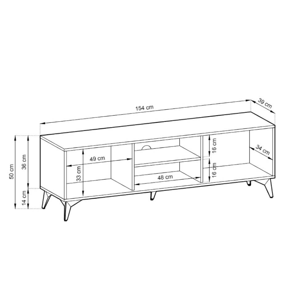 Za dwoma zamykanymi szafkami ukryjesz kable, płyty, gry i inne akcesoria, a szeroka otwarta półka pośrodku pomieści dekoder, konsolę czy soundbar. W tylnej części znajduje się otwór na przewody, dzięki któremu łatwo utrzymasz porządek w strefie RTV. Wysokie, zwężane nóżki dodają lekkości bryle, ułatwiają odkurzanie pod szafką i podkreślają jej nowoczesny charakter.