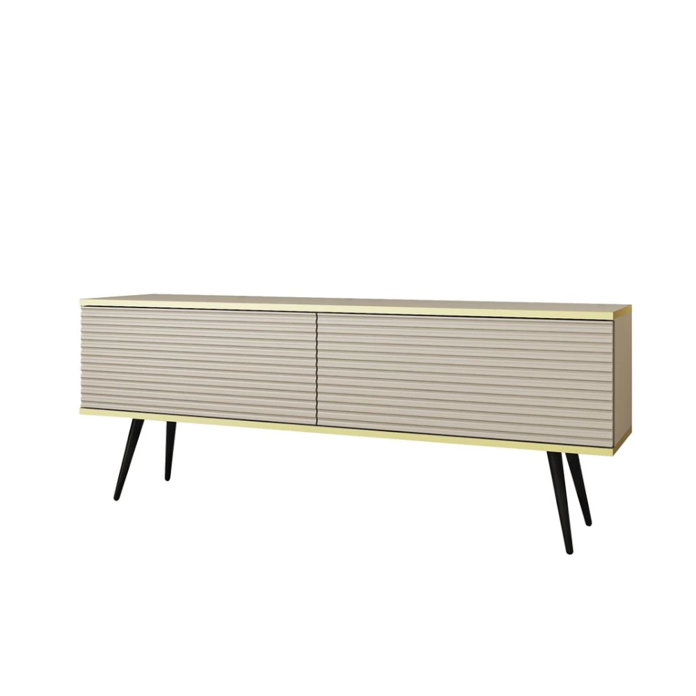 Szafka stojąca RTV Toro 135 cm ryflowana to elegancki mebel o wyrazistej, nowoczesnej formie. Front z dekoracyjnym ryflowaniem, wysokie nogi oraz subtelne złote wykończenie krawędzi nadają jej luksusowego charakteru, idealnego do reprezentacyjnego salonu.