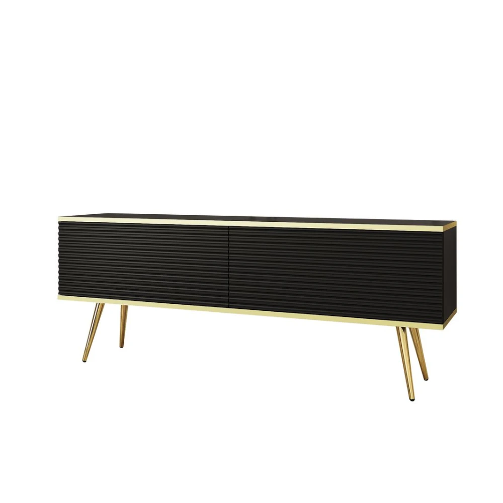 Szafka stojąca RTV Toro 135 cm ryflowana łączy efektowny design z funkcjonalnością niezbędną w strefie multimedialnej. Ryflowane fronty dodają całości głębi i nowoczesnego charakteru, a delikatna złota listwa wokół korpusu wprowadza do wnętrza nutę elegancji w stylu premium.