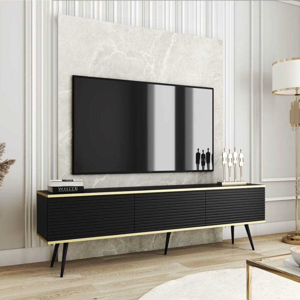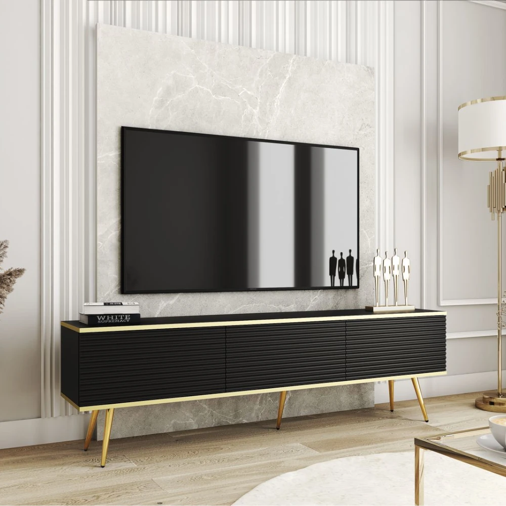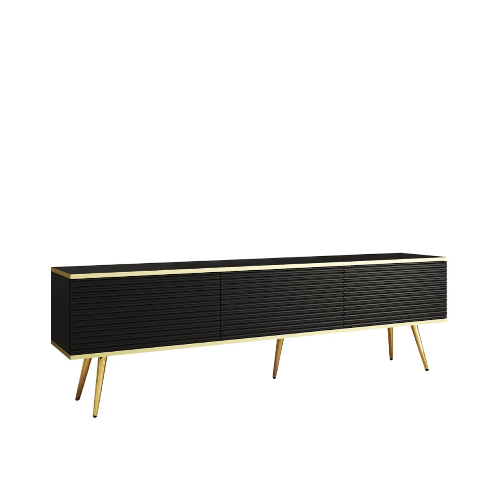 Szafka stojąca RTV Toro 175 cm ryflowana łączy efektowny design z funkcjonalnością niezbędną w dużej strefie multimedialnej. Wydłużona, prosta forma oparta na wysokich, zwężanych nogach prezentuje się lekko i nowocześnie, a fronty z poziomym ryflowaniem dodają bryle głębi i wyrazistości. Całość dopełnia delikatna złota listwa biegnąca wokół korpusu, która podkreśla prestiżowy charakter mebla.