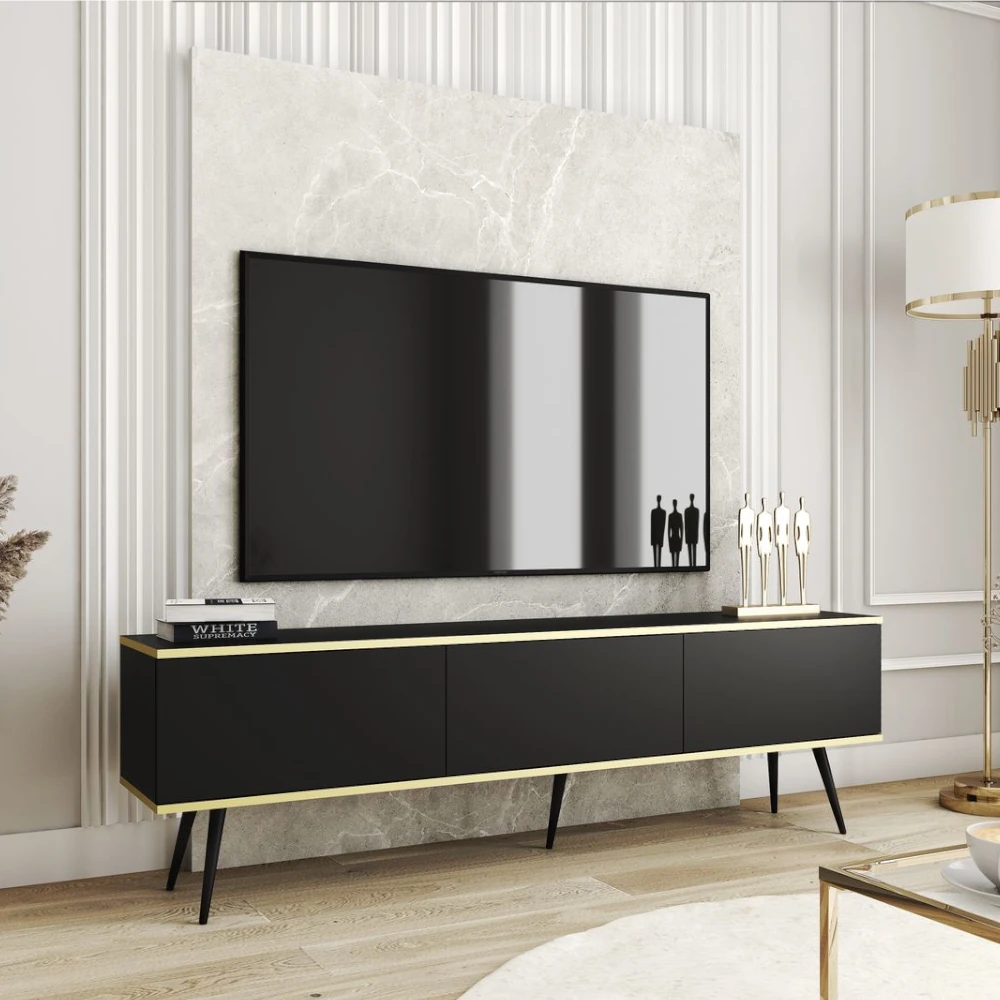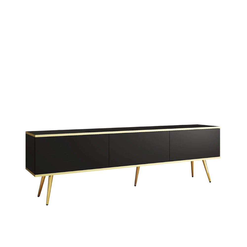 Szafka stojąca RTV Toro 175 cm łączy minimalistyczny design z funkcjonalnością idealną do dużej strefy multimedialnej. Prosta, geometryczna forma z trzema bezuchwytowymi frontami prezentuje się lekko i nowocześnie, a dekoracyjna złota listwa wokół korpusu nadaje meblowi elegancji w stylu premium. Wysokie, zwężane nogi dodatkowo podkreślają smukłą linię szafki i sprawiają, że nie przytłacza ona wnętrza.