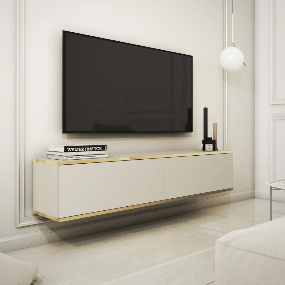 Szafka wisząca RTV Toro 135 cm to elegancki, nowoczesny mebel o prostej bryle. Gładkie, bezuchwytowe fronty oraz subtelne złote wykończenie krawędzi nadają jej luksusowego charakteru, a forma zawieszona na ścianie dodaje wnętrzu lekkości i ułatwia utrzymanie porządku.