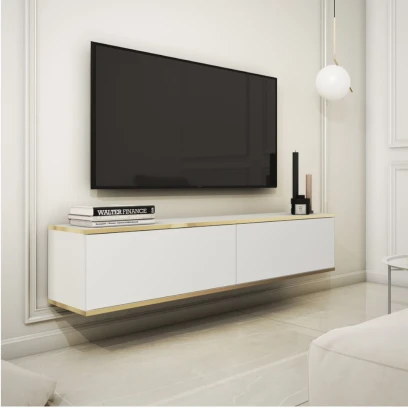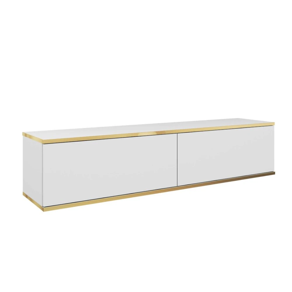 Szafka wisząca RTV Toro 135 cm to elegancki, nowoczesny mebel o prostej bryle. Gładkie, bezuchwytowe fronty oraz subtelne złote wykończenie krawędzi nadają jej luksusowego charakteru, a forma zawieszona na ścianie dodaje wnętrzu lekkości i ułatwia utrzymanie porządku.