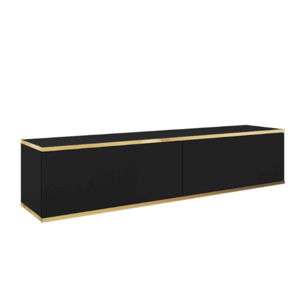 Szafka wisząca RTV Toro 135 cm to elegancki, nowoczesny mebel o prostej bryle. Gładkie, bezuchwytowe fronty oraz subtelne złote wykończenie krawędzi nadają jej luksusowego charakteru, a forma zawieszona na ścianie dodaje wnętrzu lekkości i ułatwia utrzymanie porządku.