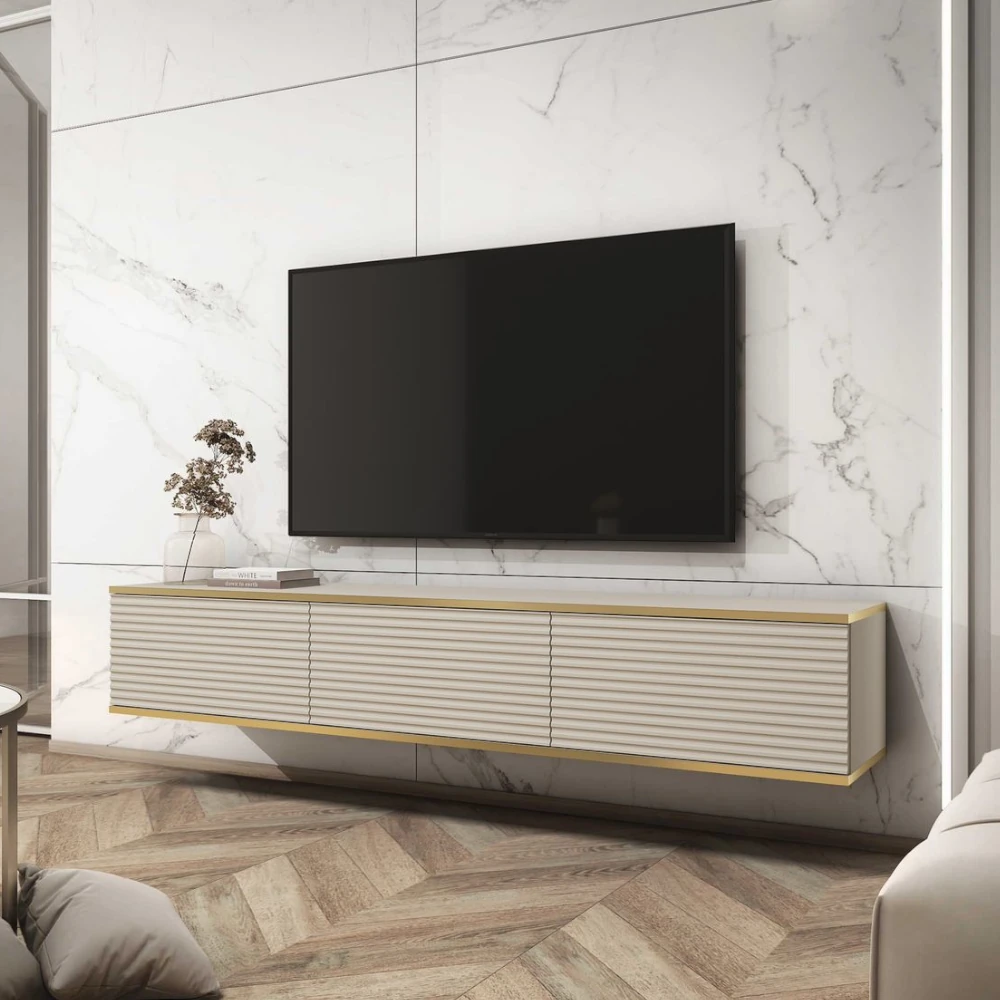Szafka wisząca RTV Toro 175 cm ryflowana to elegancki mebel o wydłużonej, nowoczesnej bryle. Front z dekoracyjnym ryflowaniem oraz subtelne złote wykończenie krawędzi tworzą luksusową oprawę dla telewizora w reprezentacyjnym salonie.