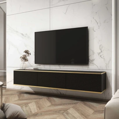 Szafka wisząca RTV Toro 175 cm ryflowana to elegancki mebel o wydłużonej, nowoczesnej bryle. Front z dekoracyjnym ryflowaniem oraz subtelne złote wykończenie krawędzi tworzą luksusową oprawę dla telewizora w reprezentacyjnym salonie.