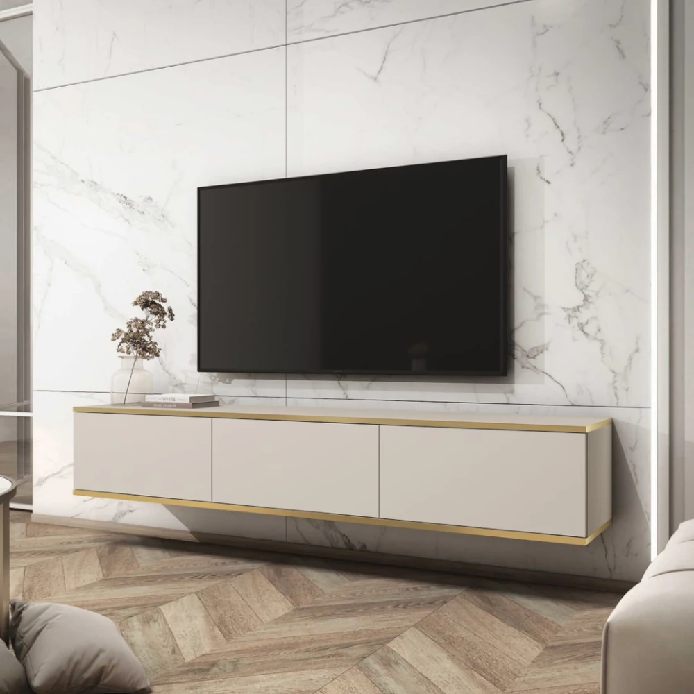 Szafka wisząca RTV Toro 175 cm to nowoczesny, elegancki mebel o wydłużonej bryle. Gładkie, bezuchwytowe fronty oraz subtelne złote wykończenie krawędzi tworzą luksusową oprawę dla telewizora w reprezentacyjnym salonie.