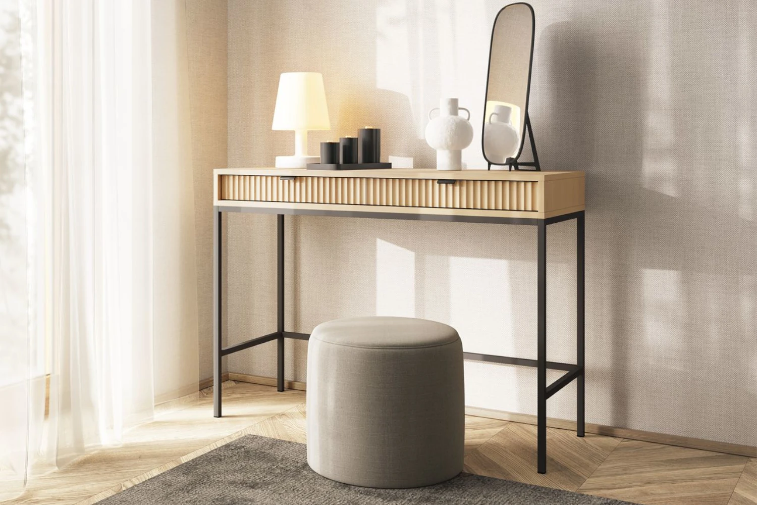 Toaletka Nuo z ryflowanymi szufladami to stylowy i funkcjonalny mebel, który stanie się ulubionym kącikiem do codziennej pielęgnacji w Twojej sypialni. Wykończona w ciepłym odcieniu naturalnego dębu, wyróżnia się dekoracyjnymi frontami z pionowymi żłobieniami, które nadają bryle nowoczesnej elegancji. Dzięki smukłym, wysokim nóżkom toaletka prezentuje się wyjątkowo lekko, oferując jednocześnie wygodne miejsce do przechowywania kosmetyków i biżuterii.