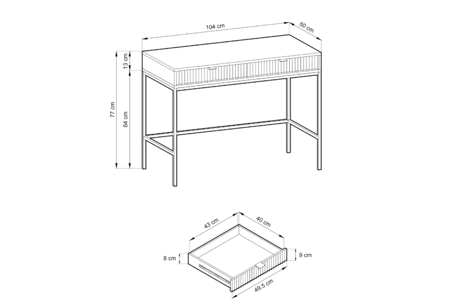 Ten elegancki mebel o optymalnej szerokości 104 cm został zaprojektowany z myślą o maksymalnej wygodzie. Toaletka posiada dwie pojemne szuflady, które pomieszczą wszystkie niezbędne pędzle, palety cieni oraz drobne akcesoria, pomagając utrzymać nienaganny porządek na blacie. Konstrukcja toaletki opiera się na płycie laminowanej, a jej krawędzie zostały wzmocnione obrzeżem ABS, co zapewnia wysoką trwałość i odporność na codzienne użytkowanie. Mebel osadzony jest na smukłych, wysokich nóżkach, które nie tylko nadają całości wizualnej lekkości, ale także pozwalają na swobodne wsunięcie pufy lub wygodnego krzesła, tworząc ergonomiczne miejsce do makijażu.