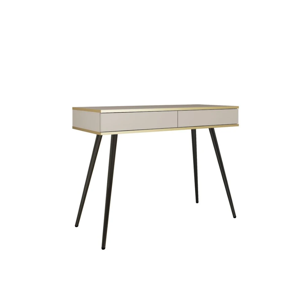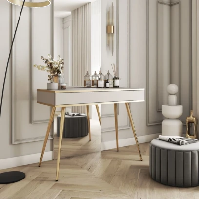 Toaletka Toro z szufladami to elegancki mebel na smukłych nogach, idealny do sypialni lub garderoby. Prosty blat, dwie praktyczne szuflady oraz subtelne złote wykończenie krawędzi tworzą stylowe i funkcjonalne miejsce do makijażu i przechowywania drobiazgów.
