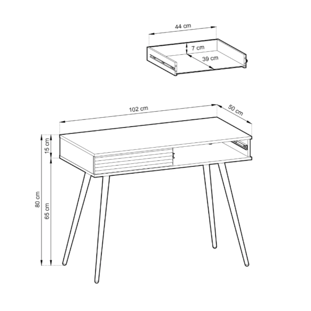 Pod blatem umieszczono dwie pojemne szuflady, w których z łatwością uporządkujesz kosmetyki, biżuterię, akcesoria do włosów czy drobne akcesoria biurowe, jeśli wykorzystasz mebel jako niewielkie biurko. Szeroka powierzchnia blatu zapewnia komfort podczas wykonywania makijażu, stylizacji czy pracy przy laptopie, a jednocześnie stanowi idealne miejsce na lustro i dekoracje.